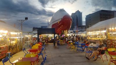 タイ料理を中心にリーズナブルな屋台が並んでいて、ジャンボジェットの下付近のテーブルで食事します。