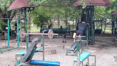 公園内の売店でご近所のおばさんがおしゃべりしたり、公園内の筋トレ場所でマッチョなおじさんがトレーニングしたりしていました。