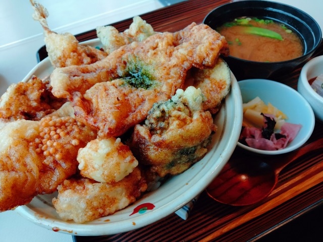 はみ出すほどの天ぷらが10品のった「にぎわい天丼(900円)」に満足しました