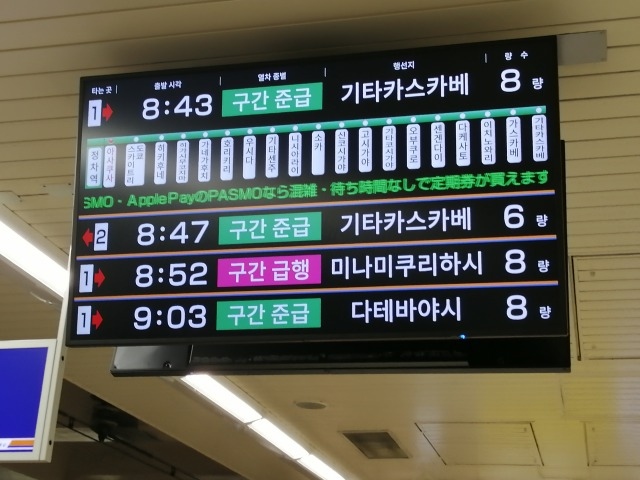 構内は、遠距離用特急ホームと、近郊用急行/普通ホームに分かれていて、日本語/英語/韓国語で時刻表示されていました。