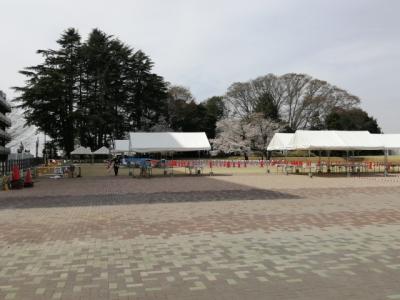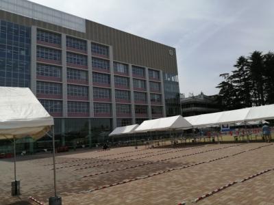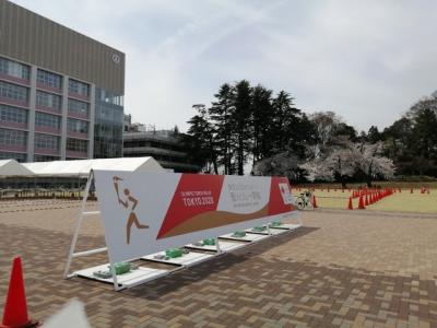 オリンピック聖火リレーの到着地点で、スタッフがその準備に追われていました
