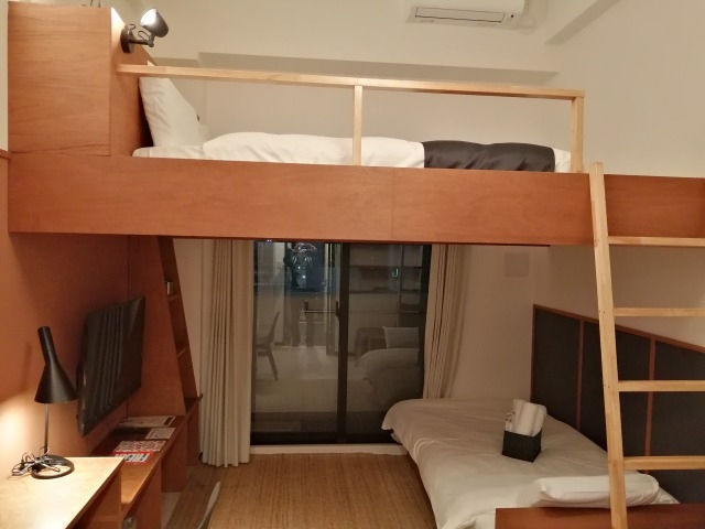 部屋にロフトベッドを増設したつくりで、キッチン/食器もついたワンルームマンション風でした
