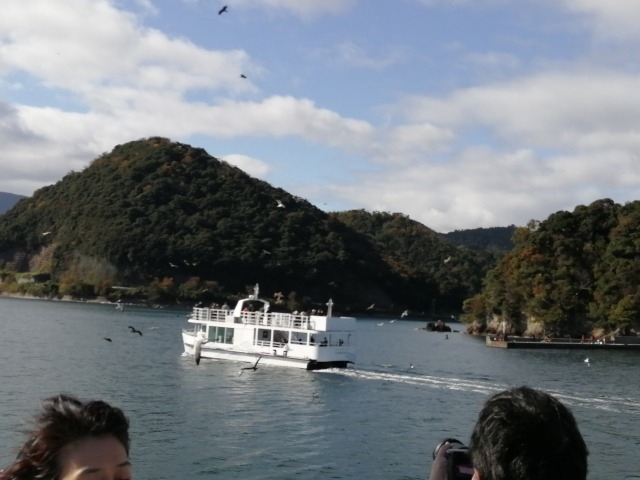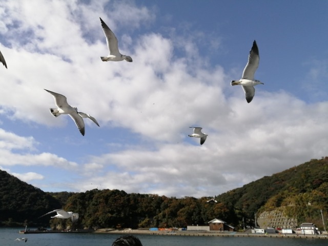 観光船が出港後に、寄ってきたカモメにかっぱえびせんを差し出すと、すぐに食いつきました。放り投げると空中でキャッチしました。