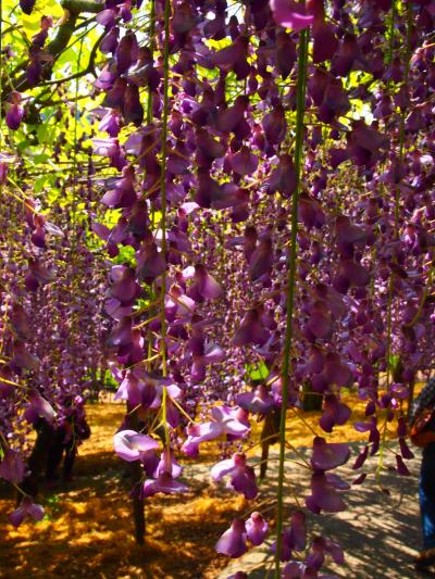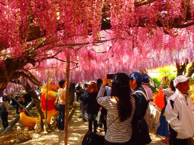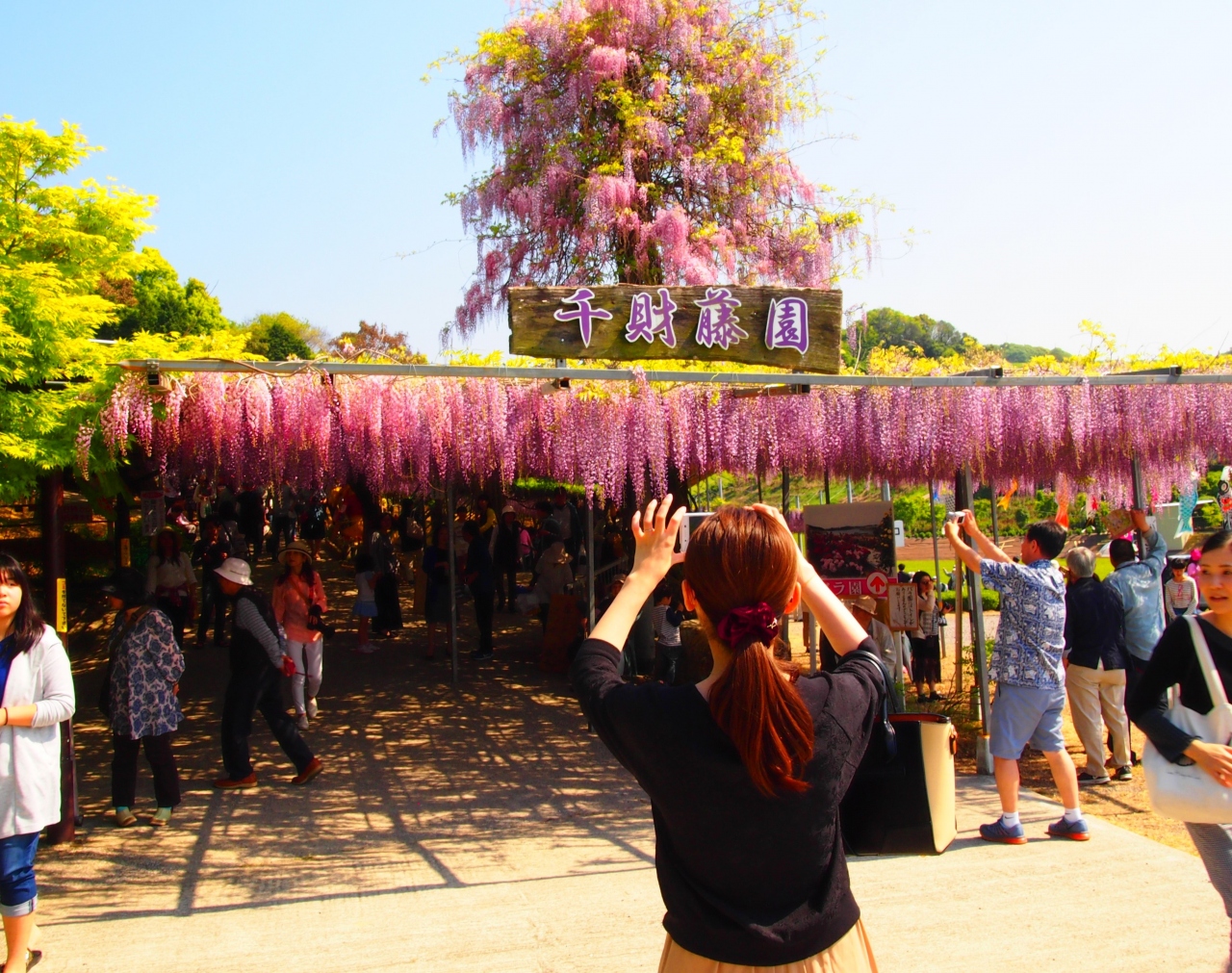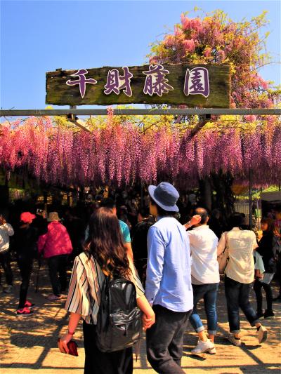 藤の花の種類は 八重黒竜 あけぼの藤 野田長藤等があり 一重に八重・白にピンクに赤にと咲く藤棚の下を歩くと色だけでなく香りも楽しませてくれます。まだまだ5月のGW連休まで楽しめそうですよ。千財農園駐車場400台・入園料はすべて無料です。8時~18時