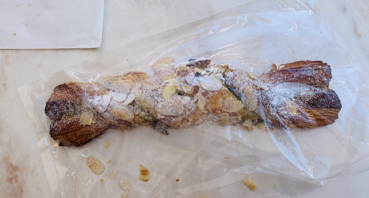 お店の前にある椅子をお借りしてクロワッサンむしゃむしゃ!ものすごいサクサク!やっぱりすぐ食べて正解!ピスタチオの方もサクサク!