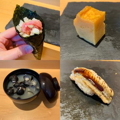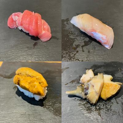 めかぶ~中トロ~ほうぼう~茶碗蒸し~めかじき~ホタルイカ~ホタテ~さわら~炙りカジキ~白エビ~湯葉豆腐~カンパチ~あわび~雲丹~ネギトロ巻き~卵焼き~アサリ味噌汁~穴子~かんぴょう~水菓子!