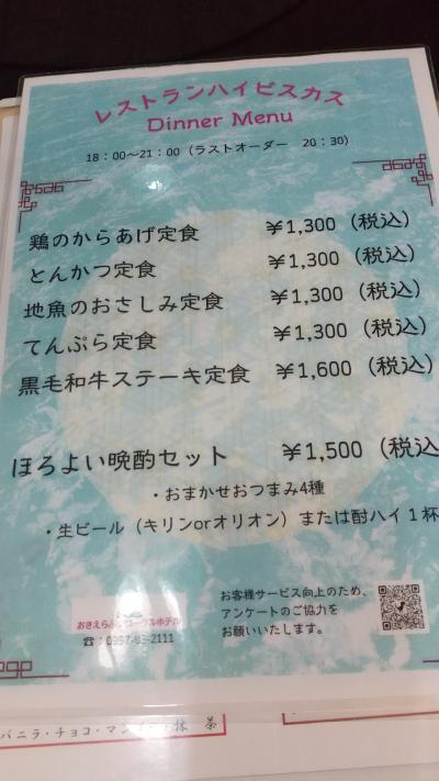 フローラルホテル内にあるレストランです。1300円~1600円の定食があり、飲まずにサクッと夕食を食べたい一人旅おばさんには便利でした。定食はものによって、内容に差があり、刺身定食は貧相でしたが、天ぷら定食とステーキ定食はそこそこ満足できました。レストランからは海が見えますが、暗くなってからだと真っ暗なので、夕日の時間帯がお勧めです。とはいうものの18時オープンなので冬場は難しい。