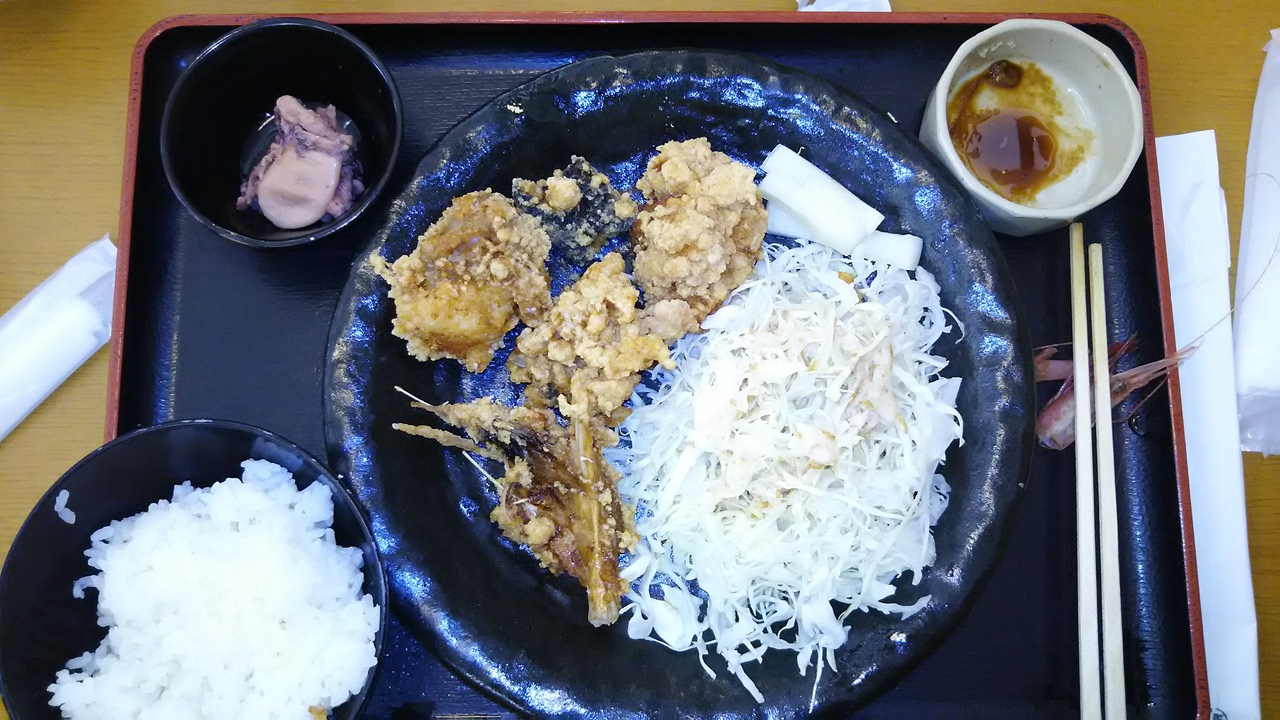 セルフサービスのお店です。メニューは海鮮丼、刺身定食、イクラ丼など10種類程度であまり多くはなく、価格も1000円程度からなので安さを期待するとちょっと違うかも。イクラが食べたかったですが、イクラ関係は全て1500円以上したので、あきらめて、アンコウ唐揚げ定食980円に。アンコウのいろんな部位が唐揚げにされていて、美味でした。量が多く、全ての部位をトライできなかったのが残念。連れが頼んだ刺身定食980円は船盛で、これまた、ボリュームに圧倒されました。食事をすると、となりの海鮮市場の5%割引券がもらえるので、買い物がてらに行くと良いかもしれません。