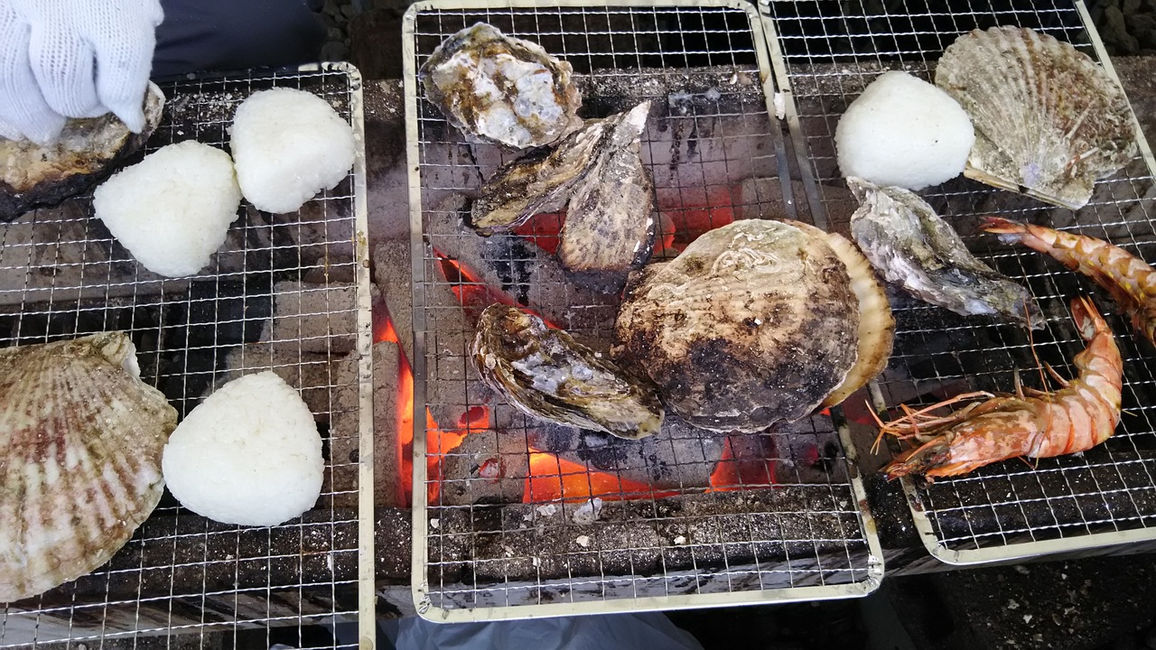 座席料1テーブル90分1500円のBBQコーナーがあり、おこした炭、網、トング、牡蠣ナイフ、割り箸、軍手、ポン酢なども付いてくるので、となりの五味の市で買った海産物で、手軽に海鮮BBQが楽しめます。五味の市では、牡蠣が30個くらいで2000円、イカ4杯1000円、エビ4匹1000円、ホタテ1枚200円でした。持ち込みも自由なので、肉やおにぎりを焼いたり、鍋をしている人もいました。50以上のテーブルがありますが、日曜日は、朝9時の開店前から数十人の人が並んでいて、大混雑でした。屋根がないテーブルもあり、雨合羽持参の人もいました。テーブルは屋根付きから順番に割り振られ、自分で選ぶことはできません。