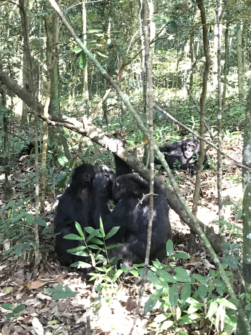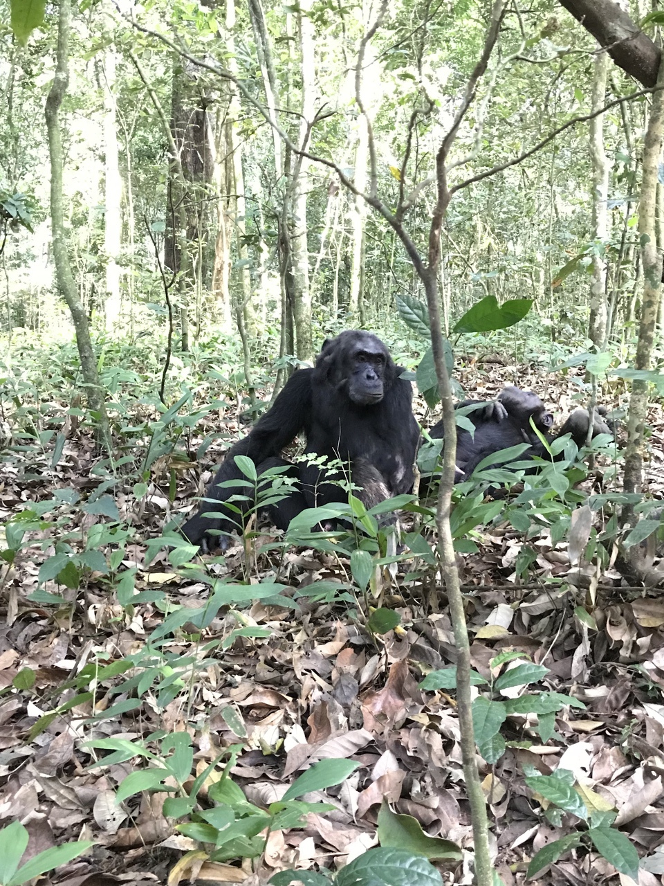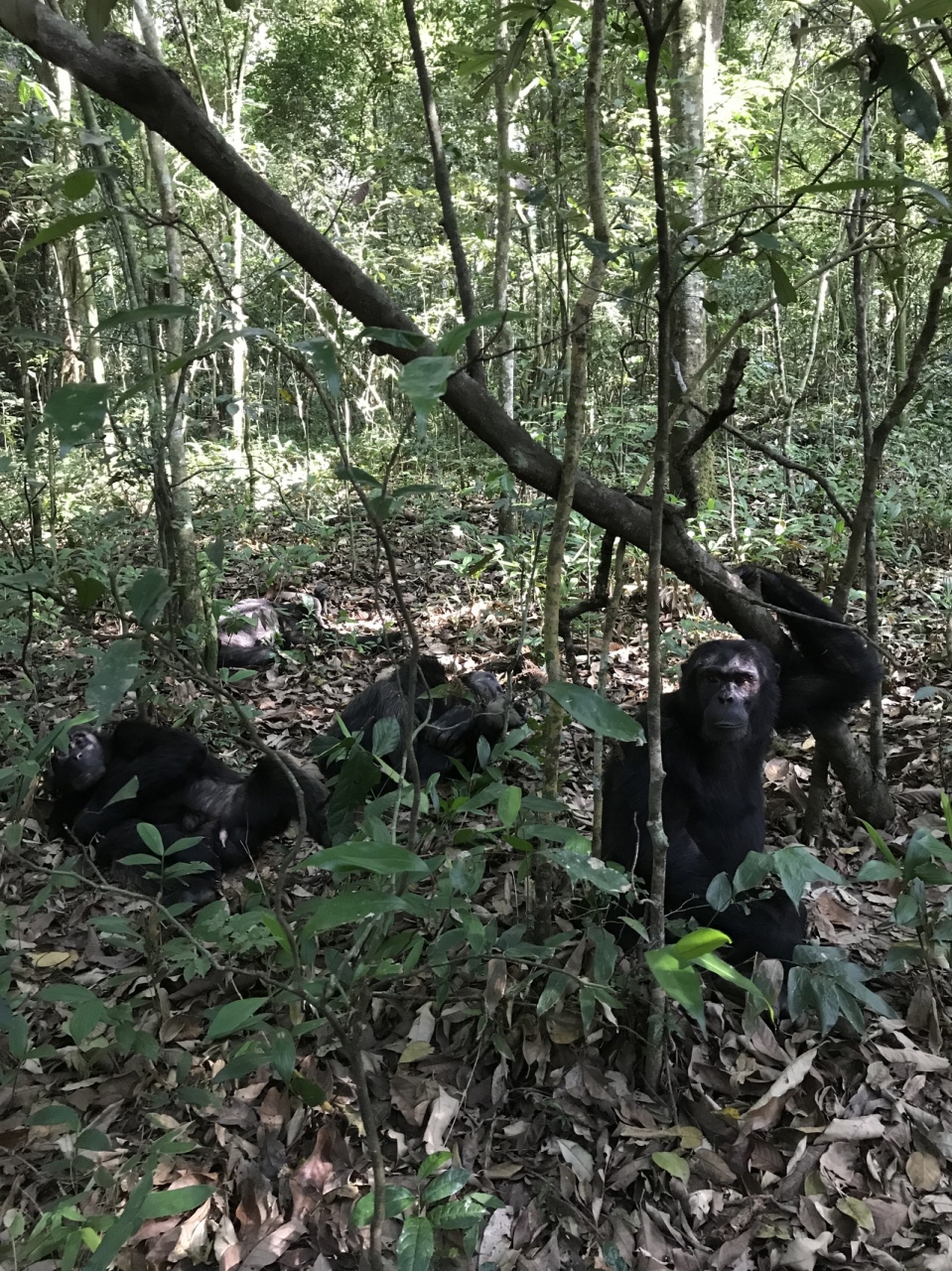 チンパンジーは木の上で生活しますが、運が良ければ近くまで降りてくることも。10頭以上のグループに会えました。かなり近くまで寄ってきて向こうもこちらを観察してきます。