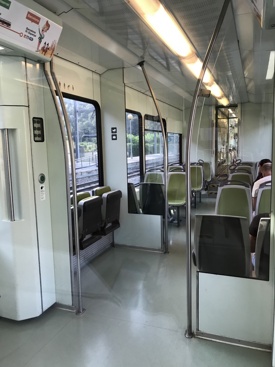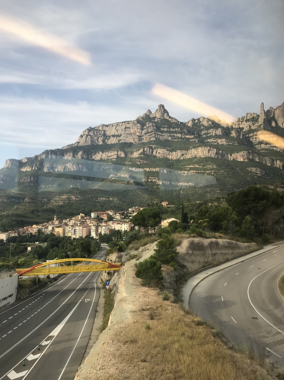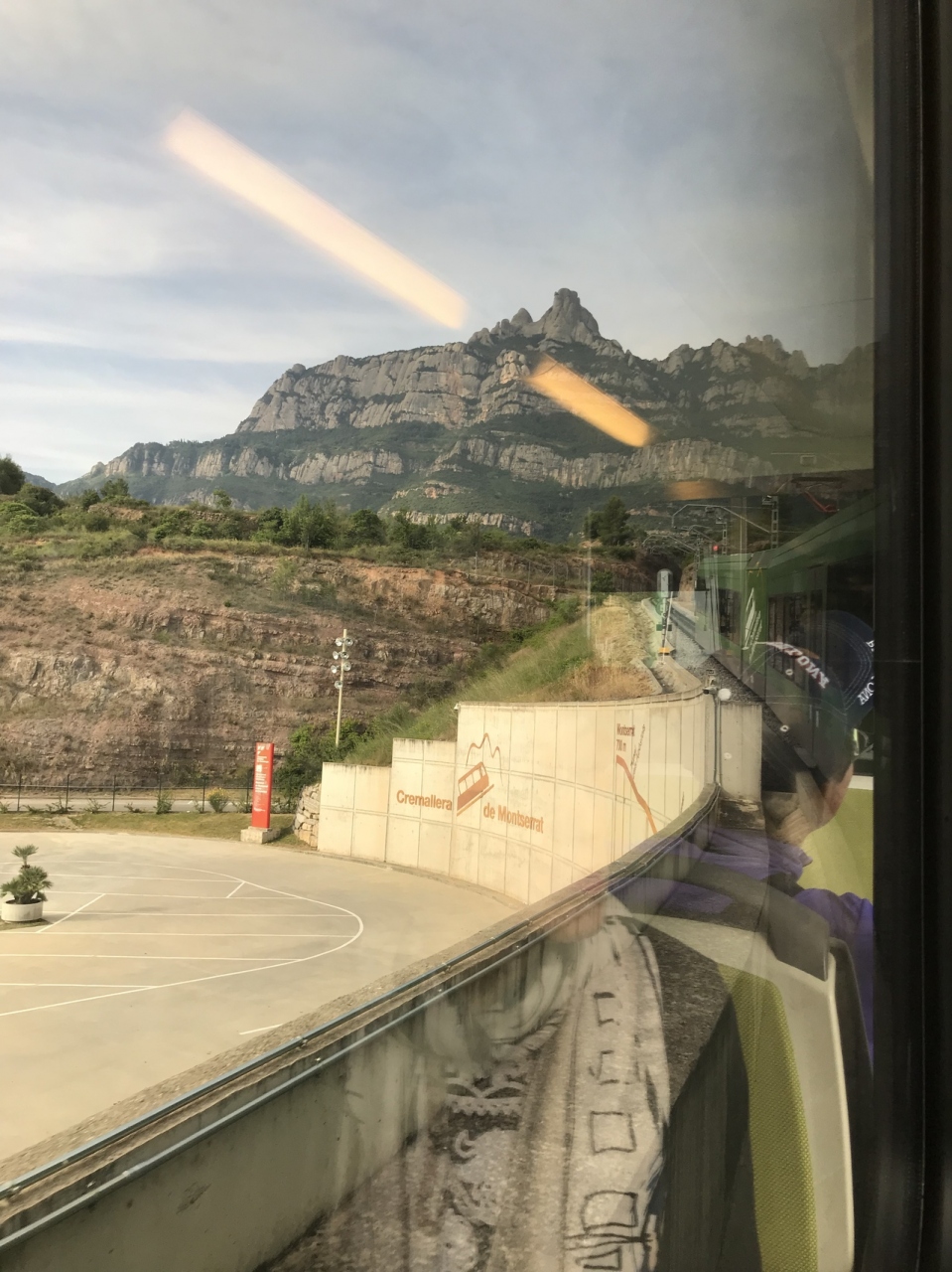 バルセロナからモンセラット まで途中登山電車かロープウェイに乗りかえます。人の流れにのり登山電車の場合は乗り換え駅で隣のホームに移動するだけで簡単です。進行方向左手の席に座ると迫ってくる山々が見えて景色がよいです。斜面ギリギリを走るので下をみるのは怖かった!