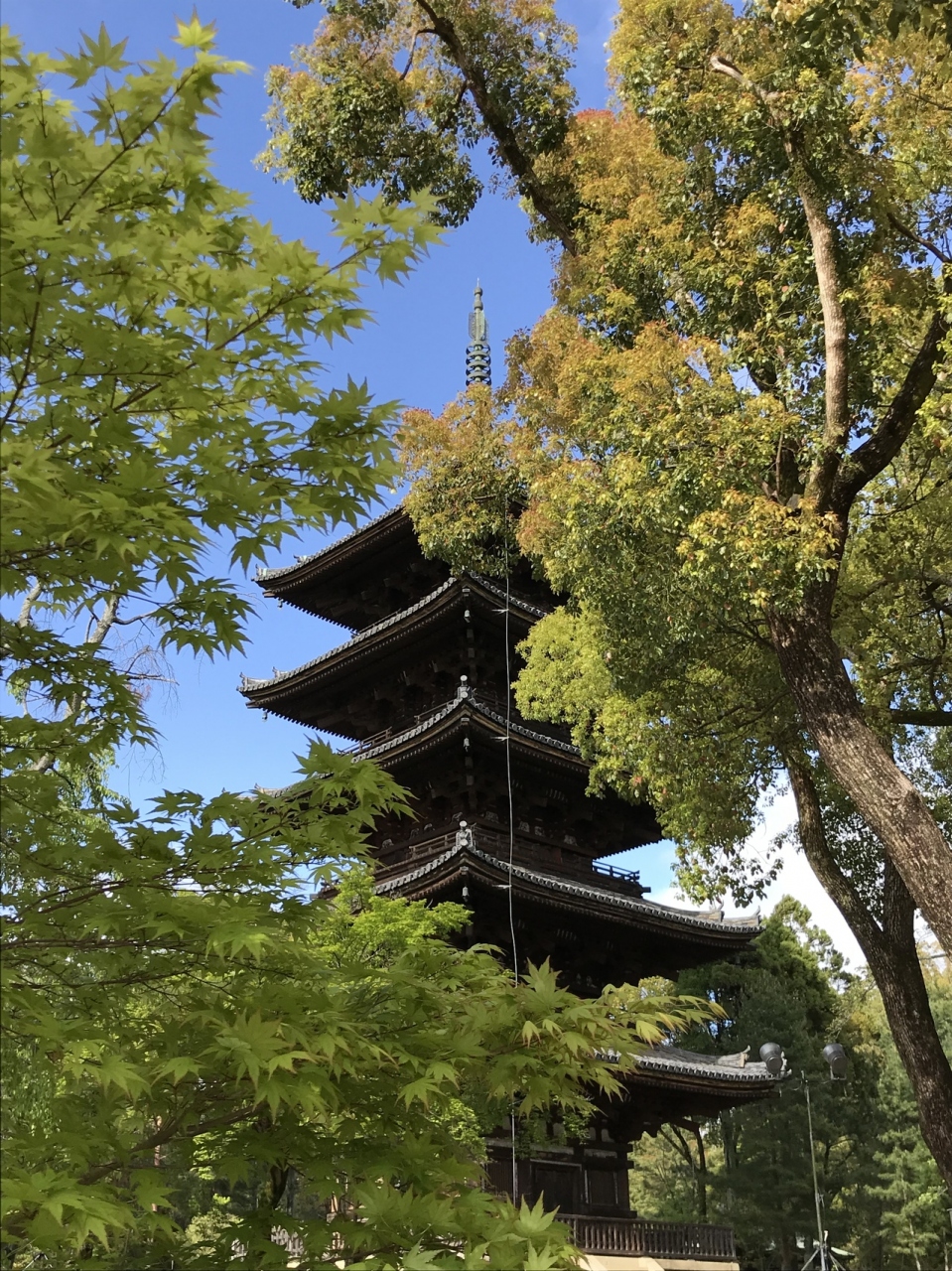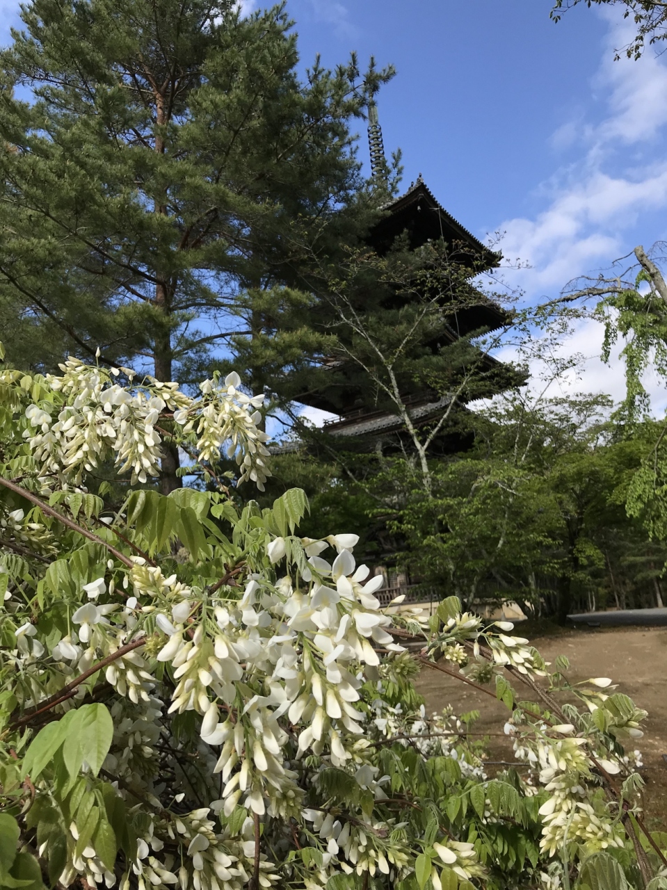 有名な五重塔です。新緑の季節に訪れたので、青空と緑色に縁取られたうつくしいバランスの五重塔が見られました。桜は残念ながら終わっていましたが、白い藤の花が近くに咲いており、甘い香りが漂っていました。桜の季節にまた来たいです。