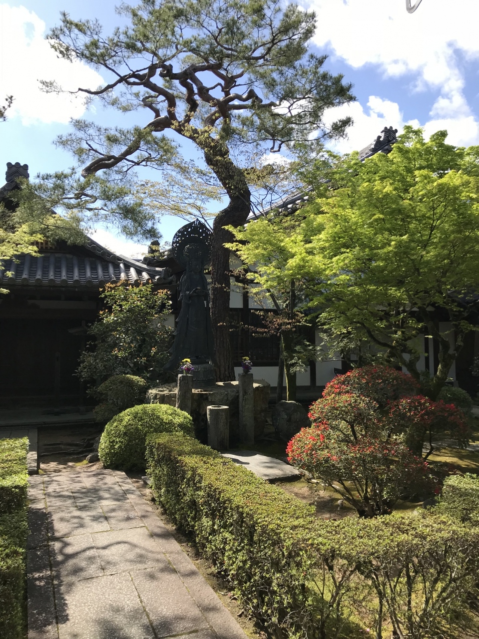 中は見られませんでしたが、書院が重要文化財だそうです。お庭の手入れが丁寧にされているのでどの季節も美しいと思いますが、訪れた春は新緑が明るい緑色の中に観音様が佇んでいて、素敵な空間でした。妙心寺はたくさんの見どころがあるお寺でした。