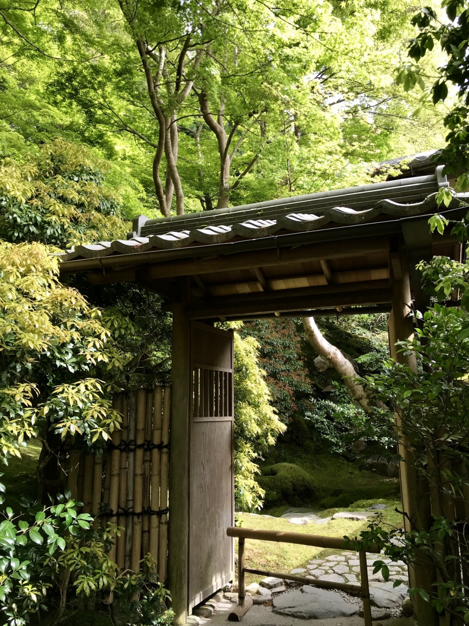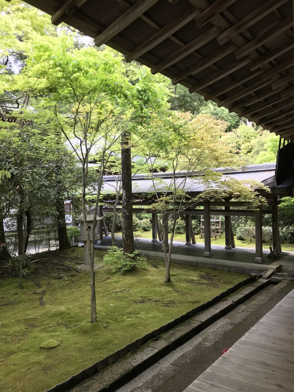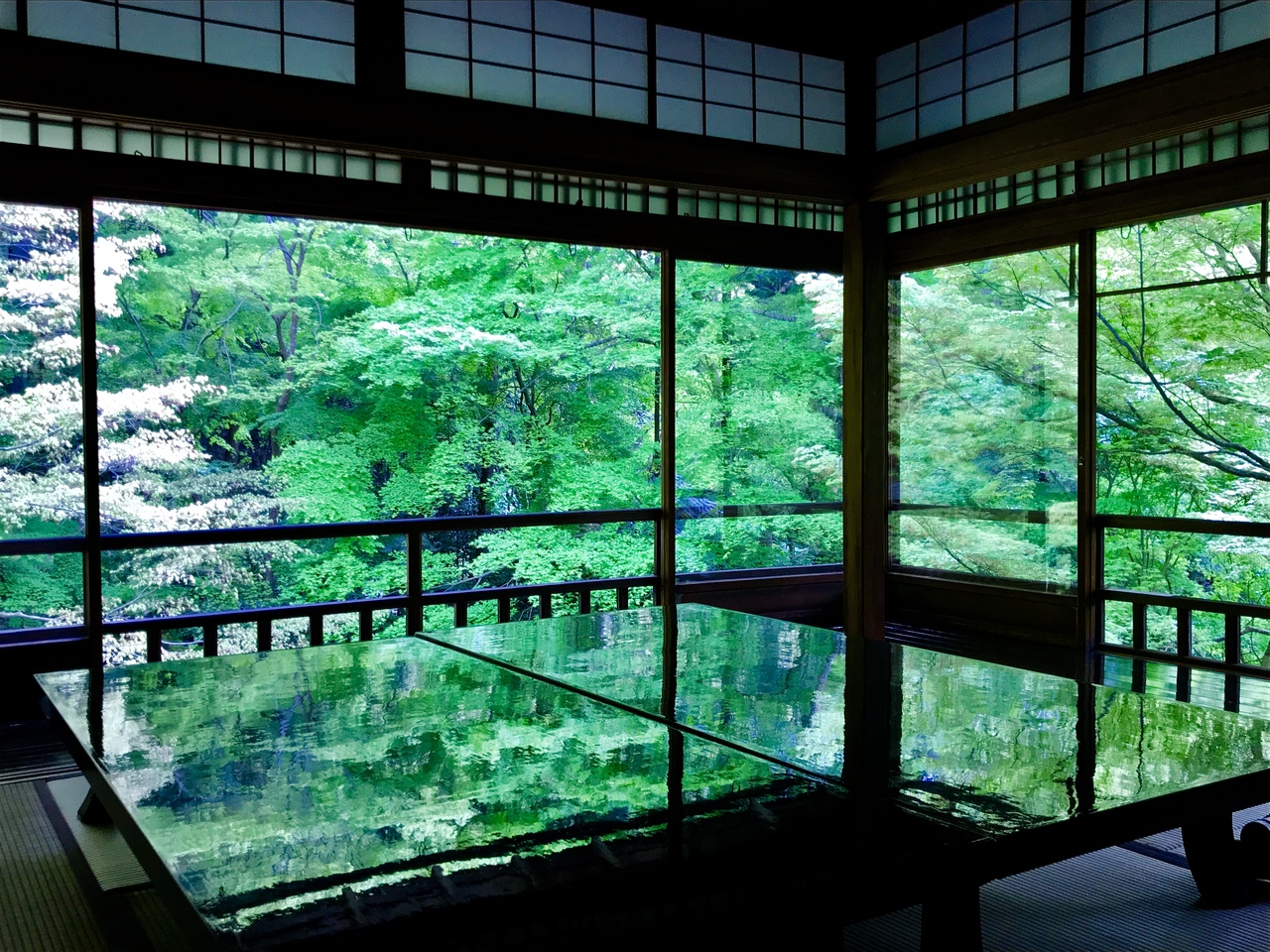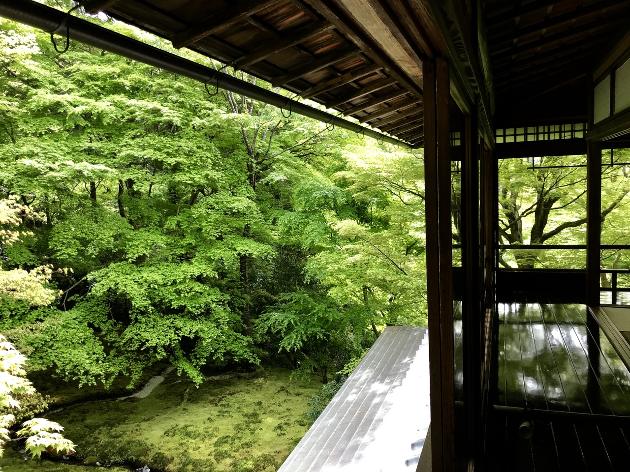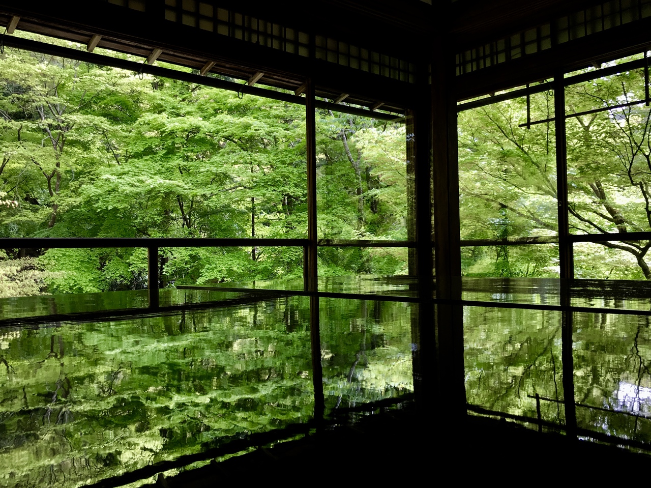 京都の中心地から叡山電鉄で30分ほどの山奥にひっそりとある名刹。春に期間限定特別公開されています。庭園は苔と青紅葉の緑が美しく静かで癒されます。2階の書院からみる青紅葉が光沢のある机や廊下の板に映り込み、緑に囲まれたなんとも美しい光景です。派手さはないですが、最高の癒しスポットです。