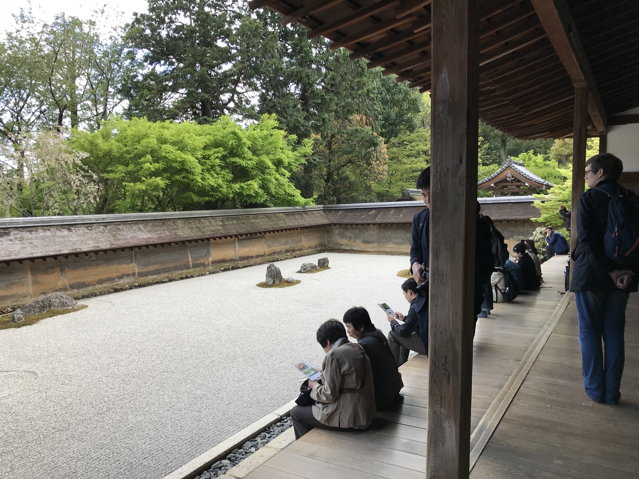 言わずと知れた夕名な枯山水庭園を見てきました。15個の石が全て見られる角度はないとのこと。静かに見たいと思っていたのですが、日本人のおばちゃん達が大声でおしゃべりしていて、残念でした。外国人の方が余程マナーをわきまえています。人が少ない早朝の拝観がよいと思います。石庭の裏にあるお庭も緑が美しく人も少なくてゆっくり考えごとをするには良いスポットでした。