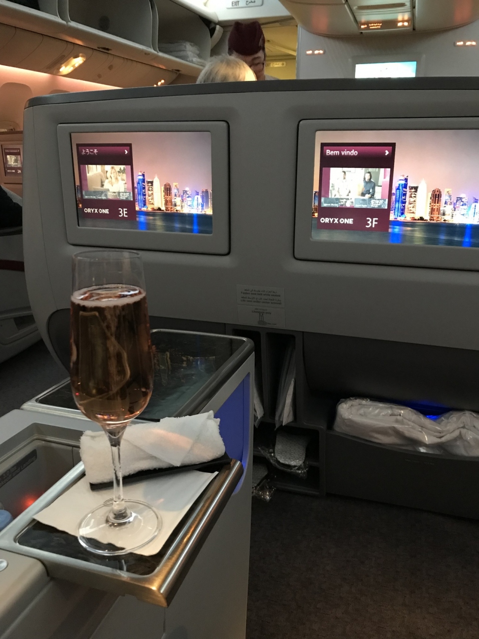 成田からドーハまでオンライングレードアップができました。ラウンジは利用できないとHPには書いてありましたが、成田サクララウンジのみ利用できました。乗り継ぎの際のドーハビズネスラウンジは入れません。フルフラットシートはシートピッチが広くてスペース十分。深夜便でしたが和食御膳を美味しくいただきました。お寿司はまずまずのお味です。朝食のスムージーが絶品でした。