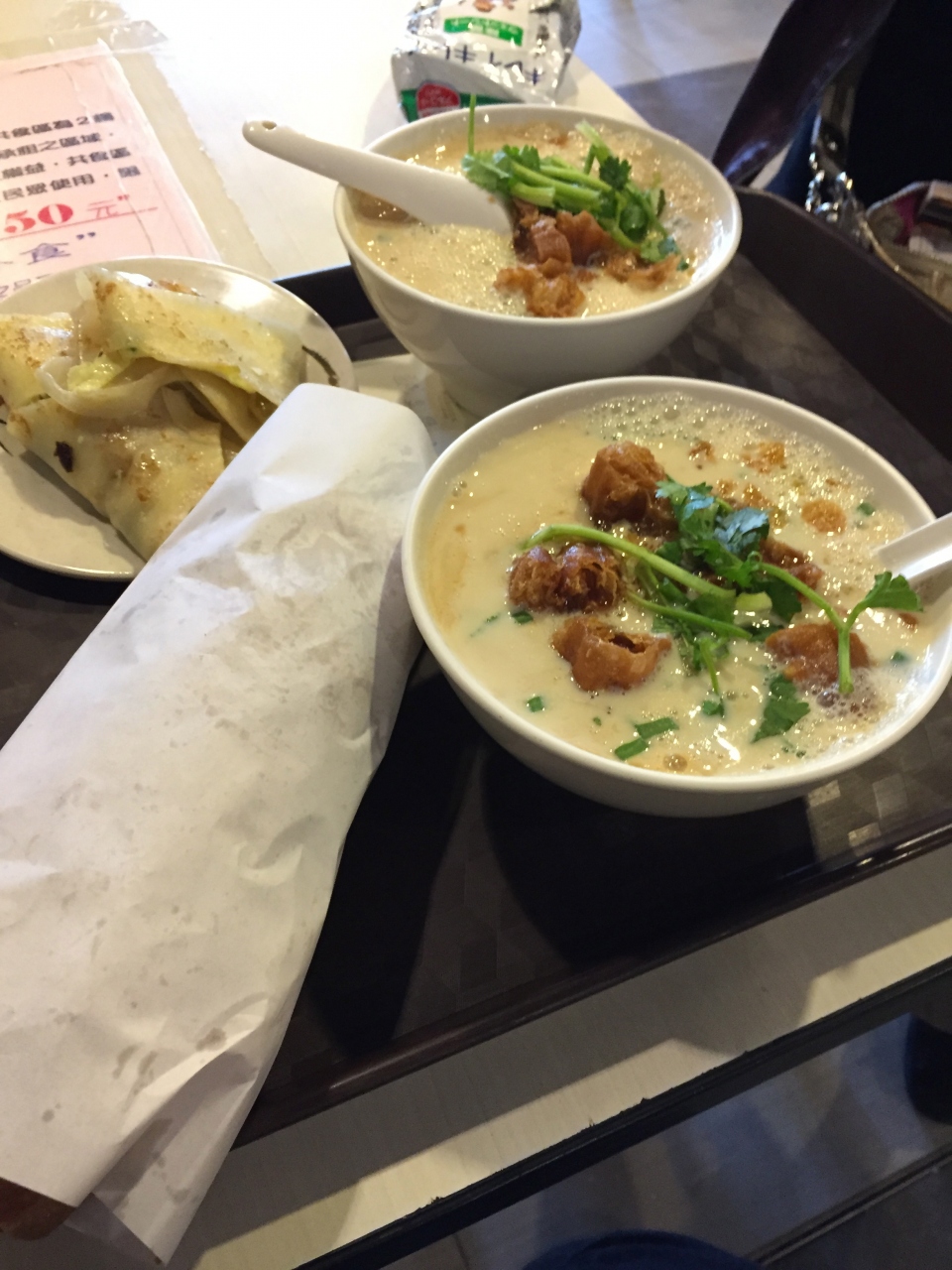 意外とスムーズに人が流れて30分くらいで入れました。日本語、英語が通じないので、事前に調べて欲しいメニューをメモして注文時に渡したらお店の人に喜ばれました。ゆるーく固めたお豆腐(ほぼスープ)に揚げパンを合わせていただきます。やさしいお味で大好きになりました。一緒に頼んだ揚げパンのサンドイッチみたいなメニューは少し重いかな、、と思いましたが、このお店は朝ご飯にもってこいです!