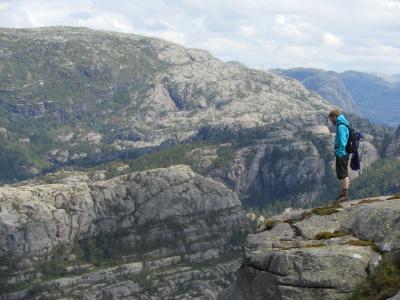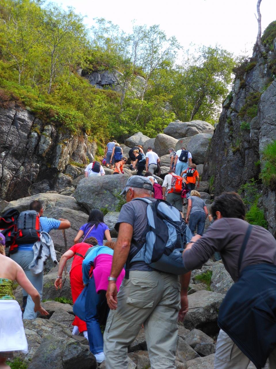 「自然の色に勝てる色はない」ことを感じさせてくれた4時間の山登り(普通はもっと早く着くみたいですが)。空のクリアな青と山のふかーい緑を楽しみながらゆっくりゆっくり、プレイケストーレンを目指して歩きました。途中険しい道もありますが(写真参照)、世界中から老若男女がそれぞれのペースで前へ進みます。犬を連れた人、自転車に乗った人もいました。プレイケストーレンまでの道のりも含め、ここは人生に一度は見ておきたい絶景かもしれません。