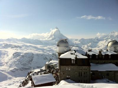 ツェルマットからゴルナーグラート鉄道にて約45分、終着駅の展望台からのアルプスの絶景。快晴のマッターホルンを眺めながら、頂上のレストラン(テラス席)で食べるチー...もっと見る