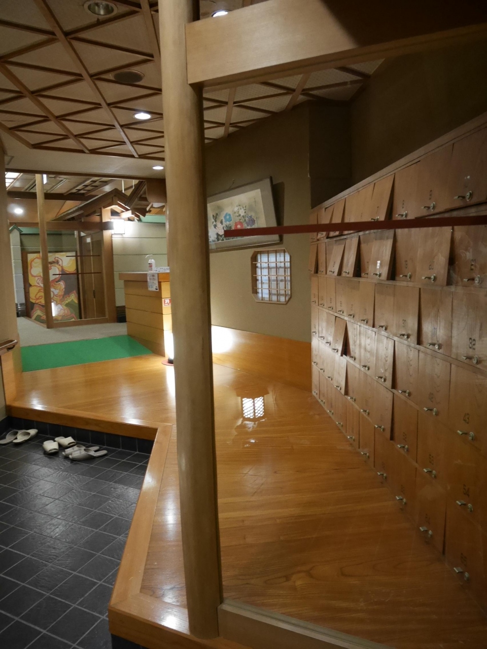 「どんどこ湯」はホテルフロントから、広大なお庭を眺めながら、途中にウサギ小屋があったりする渡り廊下を2,3分歩いたところにあります。
