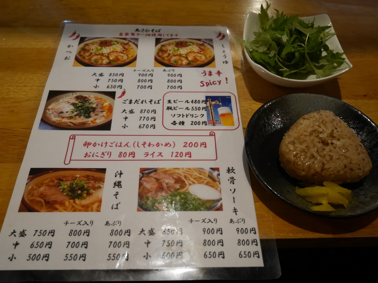 店名にもなっている「あさひそば」のかつおとごまだれを注文。ラー油は結構辛みが強く、ほとんど取り除いて食べましたが、それで十分な辛さがありました。
