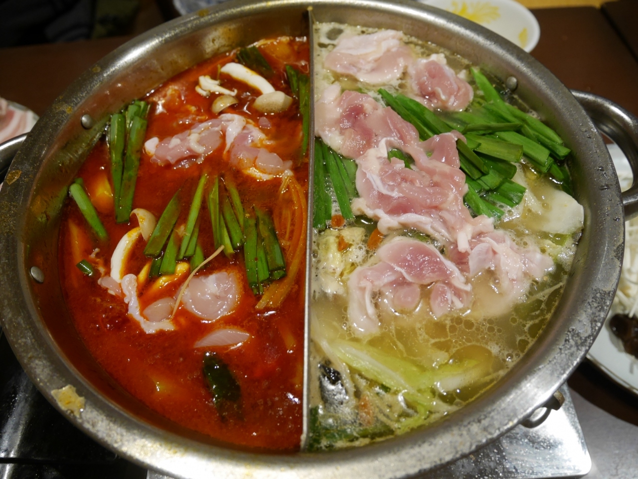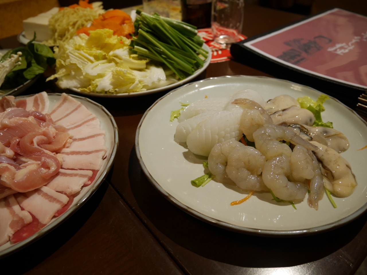 鶏スープと唐辛子スープの2種類を選びましたが、やっぱり唐辛子スープはかな~り辛い! お替り自由なので、海鮮と野菜をお替りして満腹になりました。