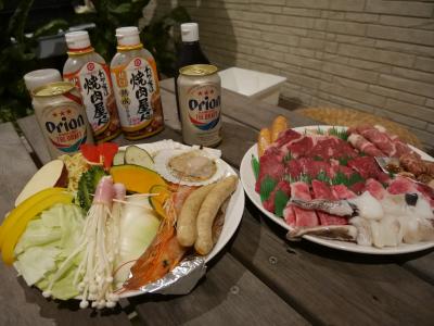 到着日の夜はテラスでバーベキューをいただきました。石垣牛・美崎牛・アグー豚などの上質なお肉が食べきれないほど盛られていて、さらに海鮮物や島野菜などもあります。これで3,000円(税別)では材料費だけで赤字じゃないでしょうか。飲み物は持込み可能だそうですが、ホテルでお願いしてもオリオンビール1缶300円と良心的。その上、オーナーが泡盛を振る舞ってくれました。