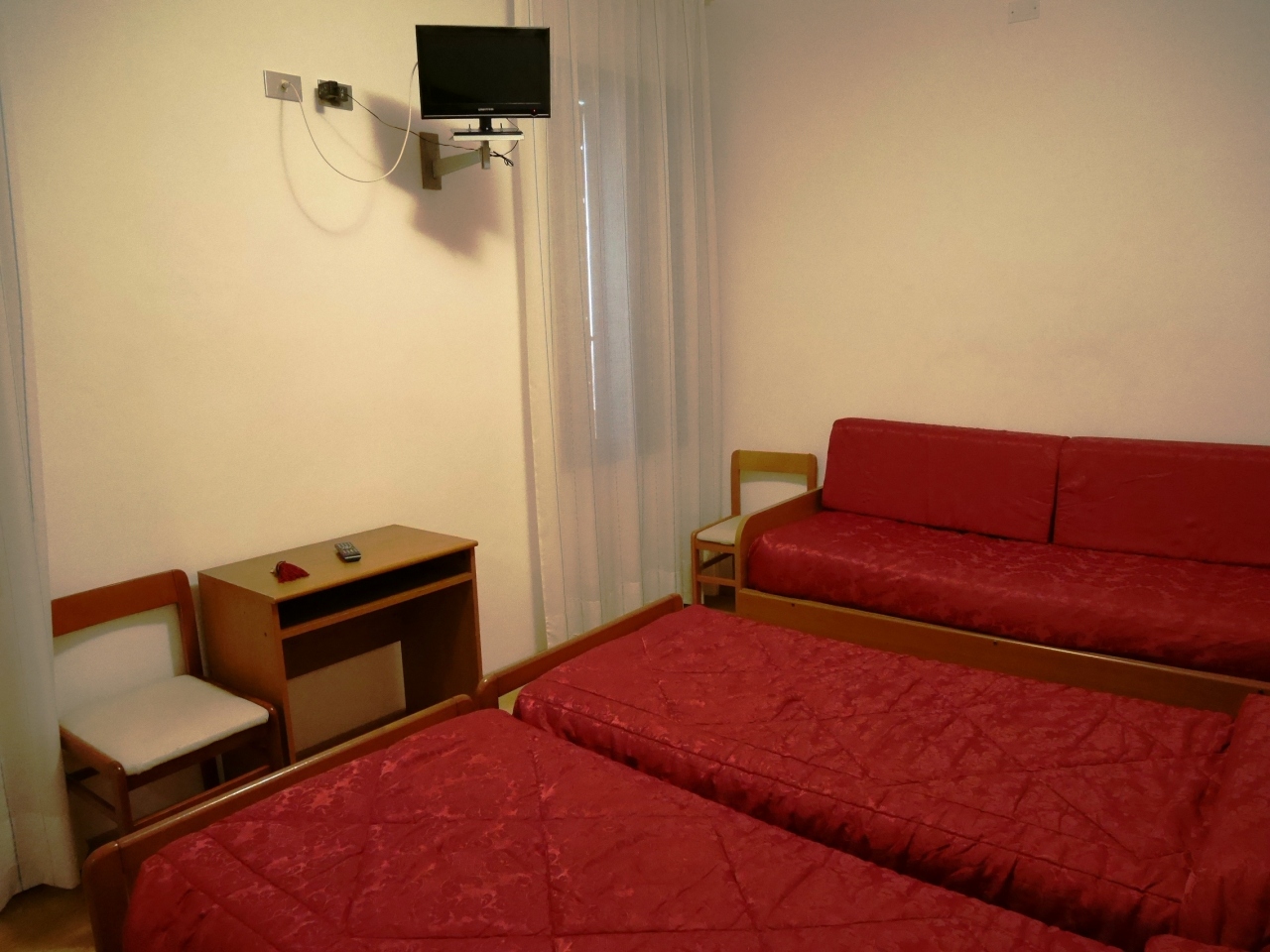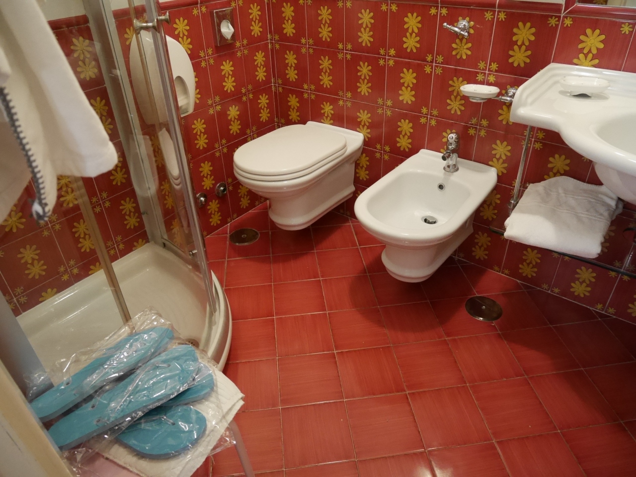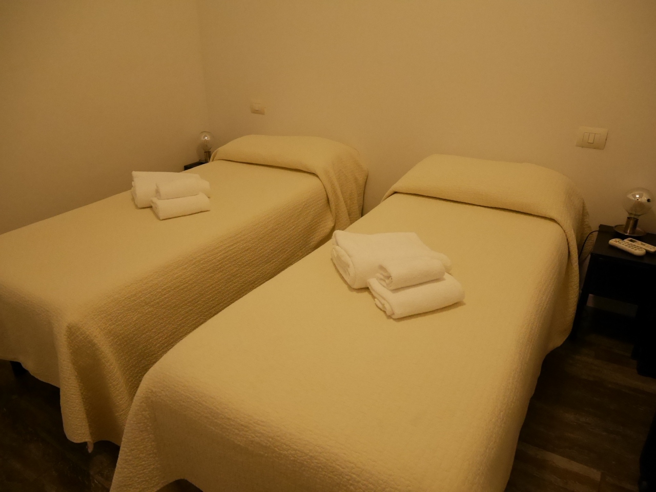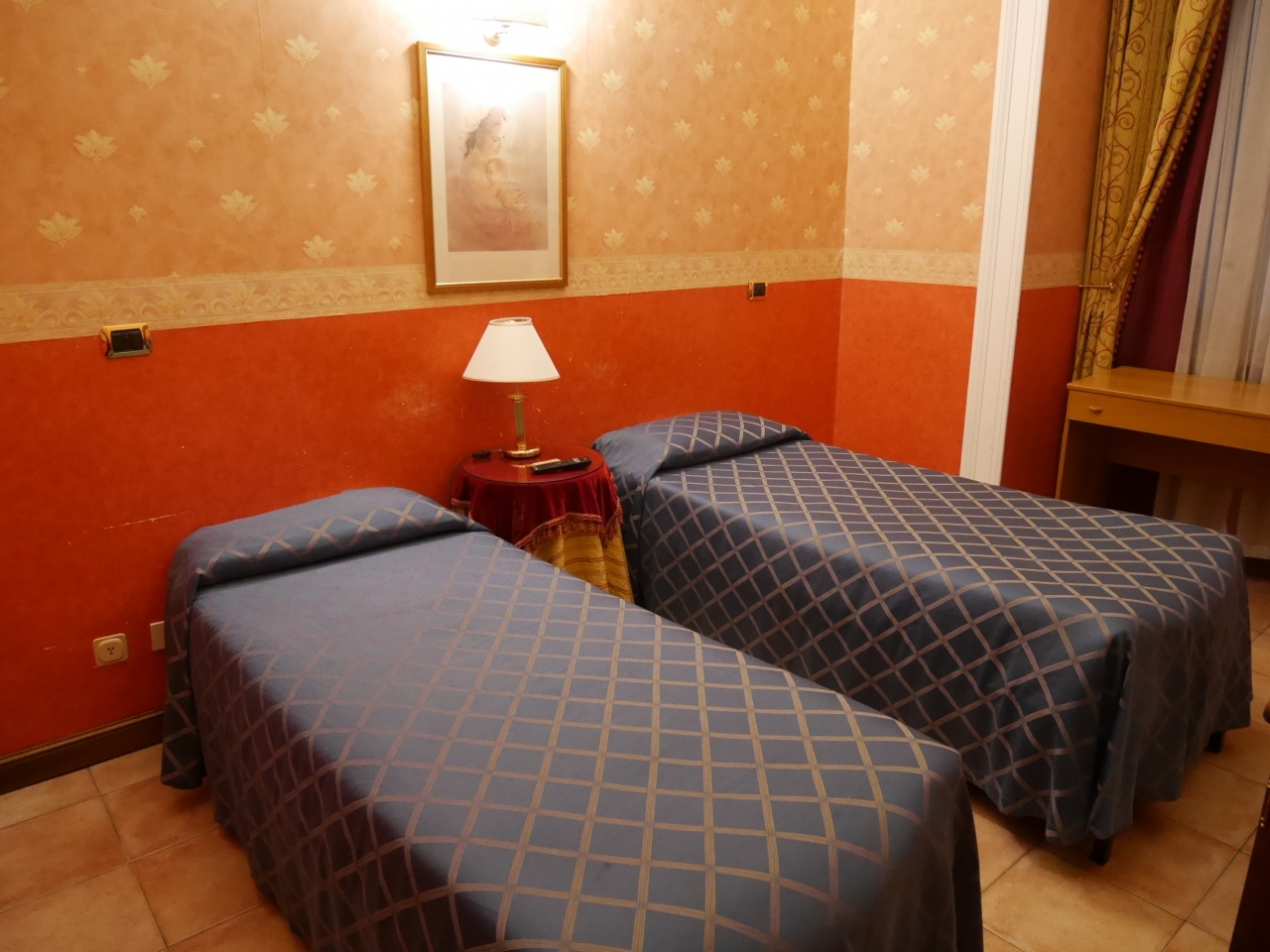 空港に夜到着し、翌朝には列車移動だったので、テルミニ駅近くのこのホテルに泊まりました。古い建物の一部のフロアを改装してホテルとして使用していて、建物の外側の看板はほかのホテルの名称でした。