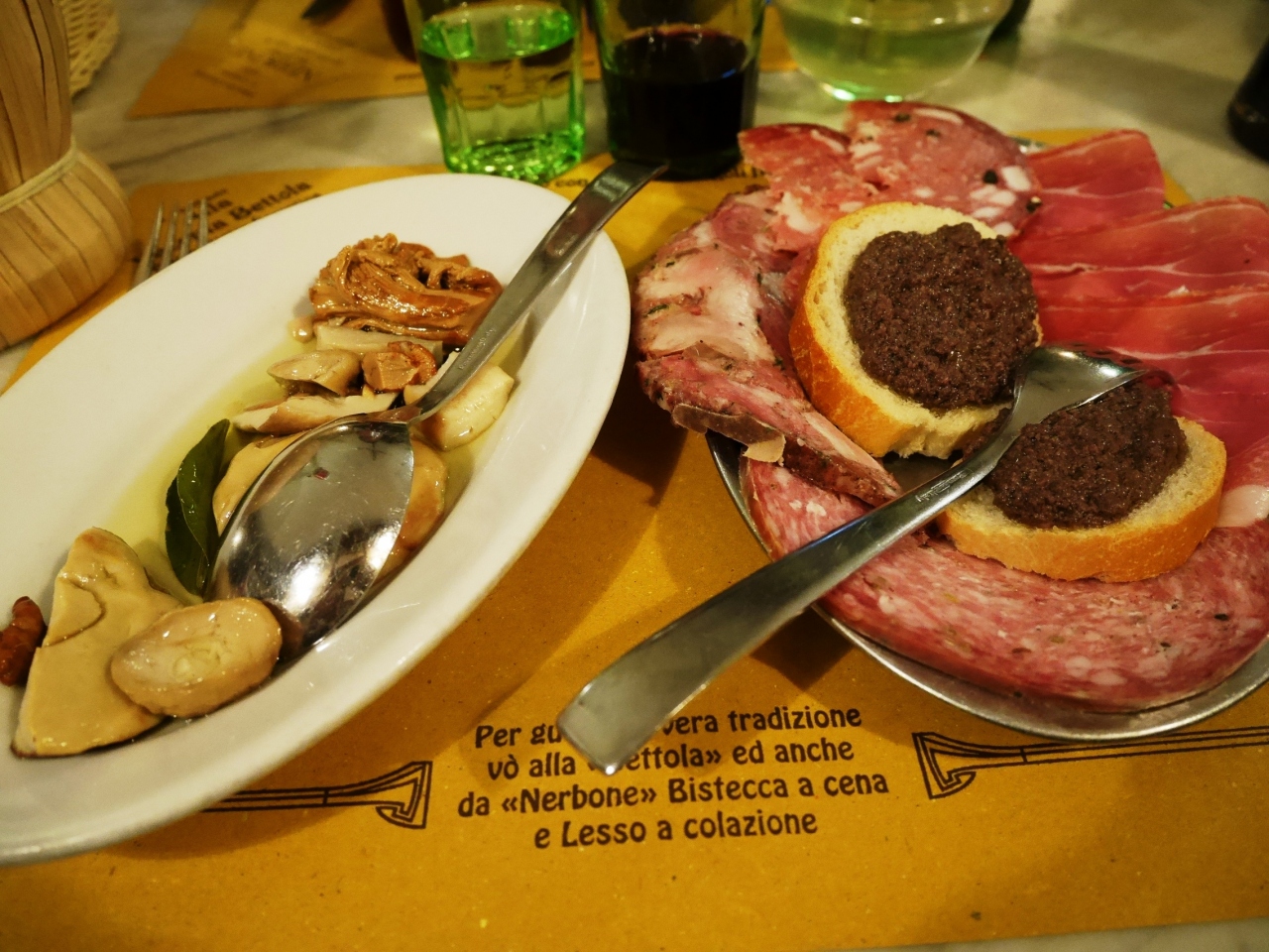 キノコの前菜、ハムの盛り合わせ、ペンネ・ベッキアベットラ、トリッパを注文。