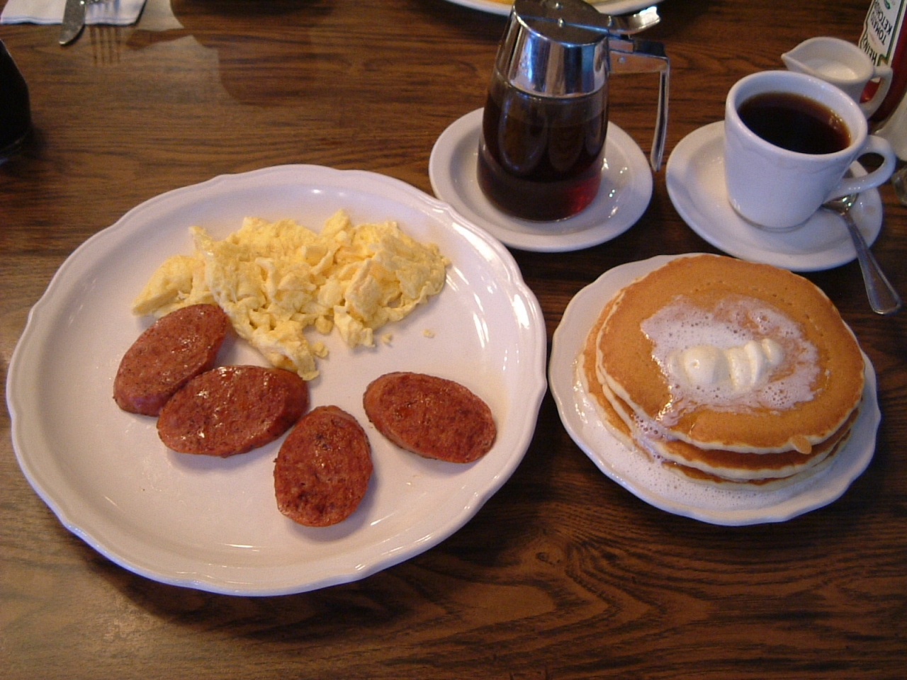 私&主人は某人気店よりこちらの方が好きです。以前、日曜日の10時ごろ行ったら、長蛇の列で驚きましたが、平日はそれほど混み合わずに入れます。今回は、スパム+卵料理+パンケーキ3枚のセットと、チーズオムレツwithハッシュポテトをオーダーして、2人でシェアしました。どれを食べても美味しいです。コーヒーは少なくなると、オバちゃん(ウェートレス) がワンコそばのように注ぎ足してくれるので、私たちはそれを“ワンココーヒー”と呼んでいますッ!