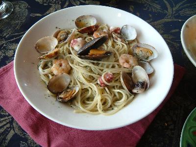(ウンベルト通り沿い、4月9日広場スグ近く) とても細い路地なので、珍しくて写真を撮る人多数ッ! 某掲示板でお薦め情報もあり、“ウニのパスタ”を食べに行ってみました。 混んでいるかと思いきや、意外にもお昼時にもかかわらず、先客は誰もいませんでした。 さてウニのパスタを注文してみると「無いッ」との事。 入口のメニューには載っているのに?! 代わりに海の幸のリゾットとイワシのパスタを食べました。 味はまぁまぁでしたが、お勘定を見てビックリ?! ビールとパスタとコーヒーで、2人で\7,000以上でした。 席料が1人€4と高く、いかにも観光客相手のレストランです。