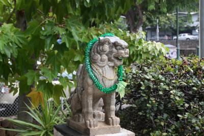 狛犬がレイをしてるのが、さすがハワイ。- 旅行時期