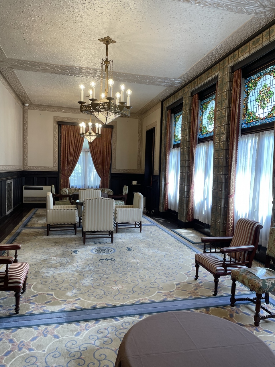 渋沢栄一の庭園内にあります。80歳と子爵に昇爵祝いに寄贈されたものだそうです。中はステンドグラスが素敵で広間にはふんだんに使われていました。二階への階段がとても素敵だったのですが、二階には上がれず残念でした。