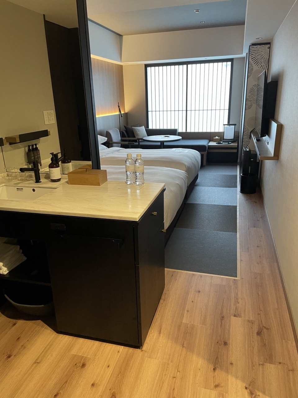 河原町御池から歩いていきました。意外に距離があります。ホテルはきれいでウエルカムドリンクがありました。チョコやドライフルーツ等の軽食もありました。部屋はアップグレードで部屋が広くなるか、元の部屋でバスタブありかの選択があり、広めの部屋を選択させていただきました。周辺にはスーパーはなかったですが飲食店はありました。