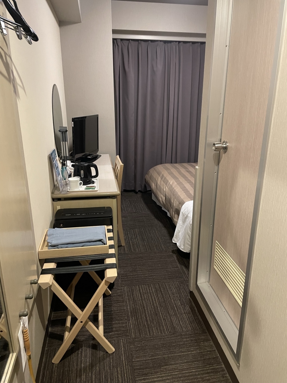 夜22時ぐらいに岡山駅から歩いていきましたが、駅周辺は治安が良いとは言えない感じです。早歩きで向かいましょう。アメニティはフロントでもらう形式で、不要な場合はスタンプカードみたいなものにハンコをもらって5つ集めるとクオカードと交換できるようです。少し古さを感じますが、スーツケースを置くところもあるし、シャンプーとリンスが分かれているのも良いです。