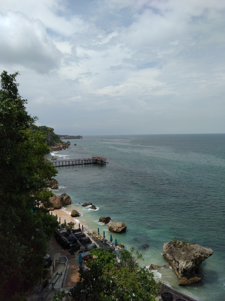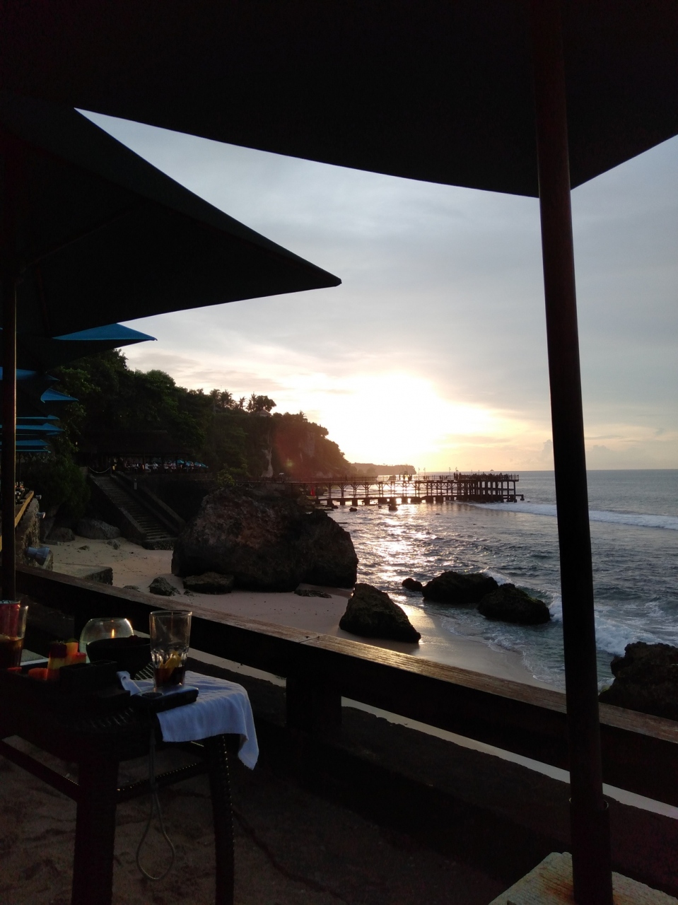 アヤナリゾートに宿泊し、ロックバーに行きました。海側に階段を下っていくと、受付があり、ホテルの宿泊者か、予約はしているかを聞かれます。部屋の番号を言うと紙が渡され、再度階段を下るとケーブルカーがあります。それに乗って下まで行くとウエイターさん達が待っており、紙を渡すと席に案内してくれます。席はちょうど夕日の見える席で最高でした。前側の席の家族のお母さんがお父さんに写真を沢山撮らせていたのが印象的です。