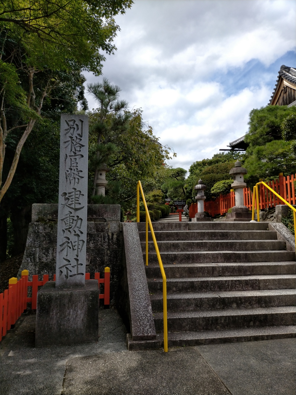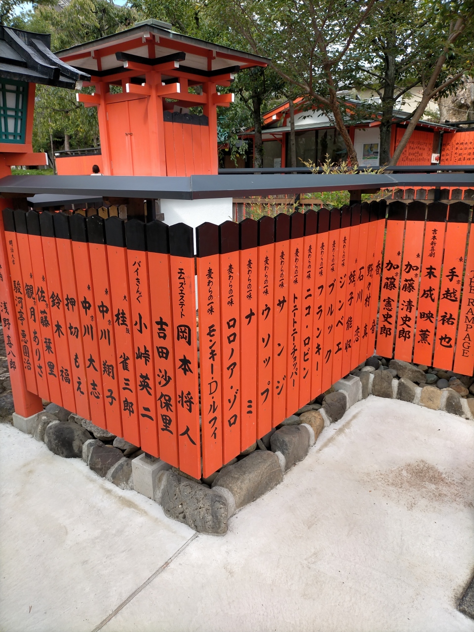 車折神社内にあります。バスで行けます。芸能神社という名前だけあって、たくさんの芸能人の名前が書かれた朱色の板があります。知らない名前もあったので、有名になりたい人の分もあるのかもしれません。名前を見つけて写真を撮っている人もいました。