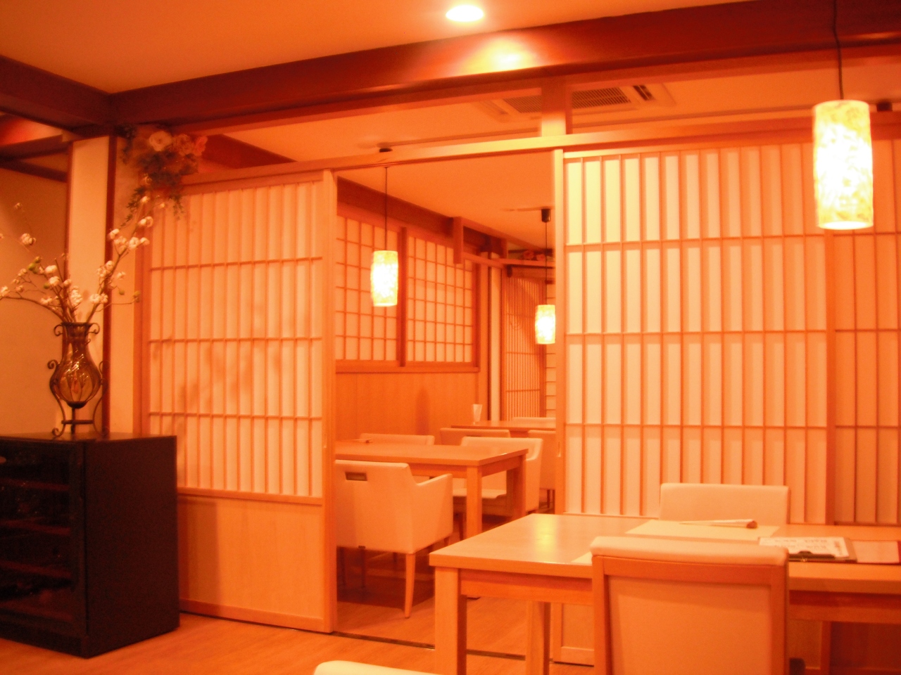 和と洋の落ち着きのある雰囲気と白の椅子がシンプルで清潔感がありました。