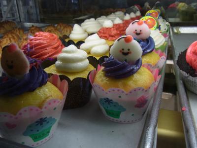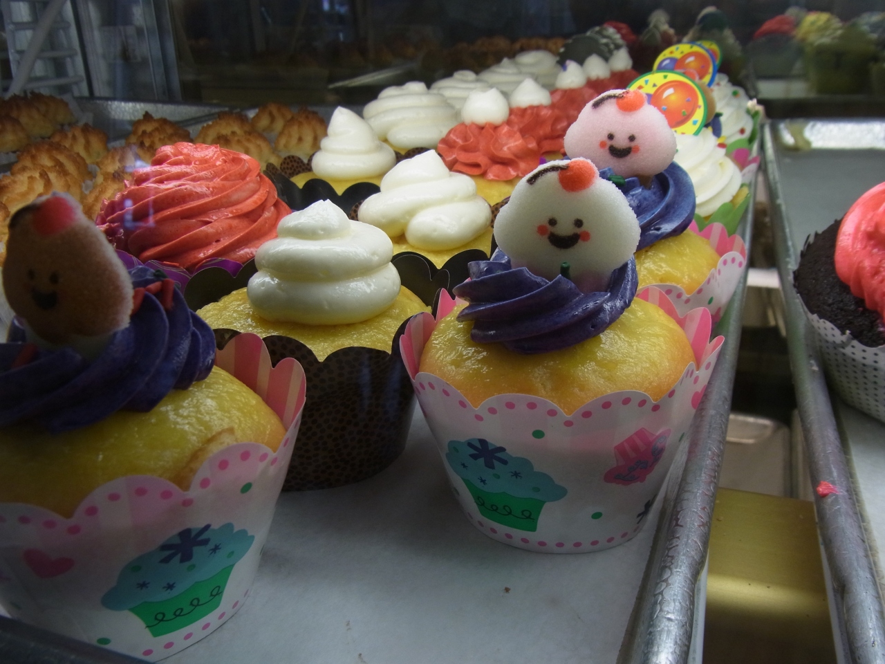 マラサダだけでなく、ショーケースには可愛らしい、ある意味毒々しいカップケーキが並んでいました。。