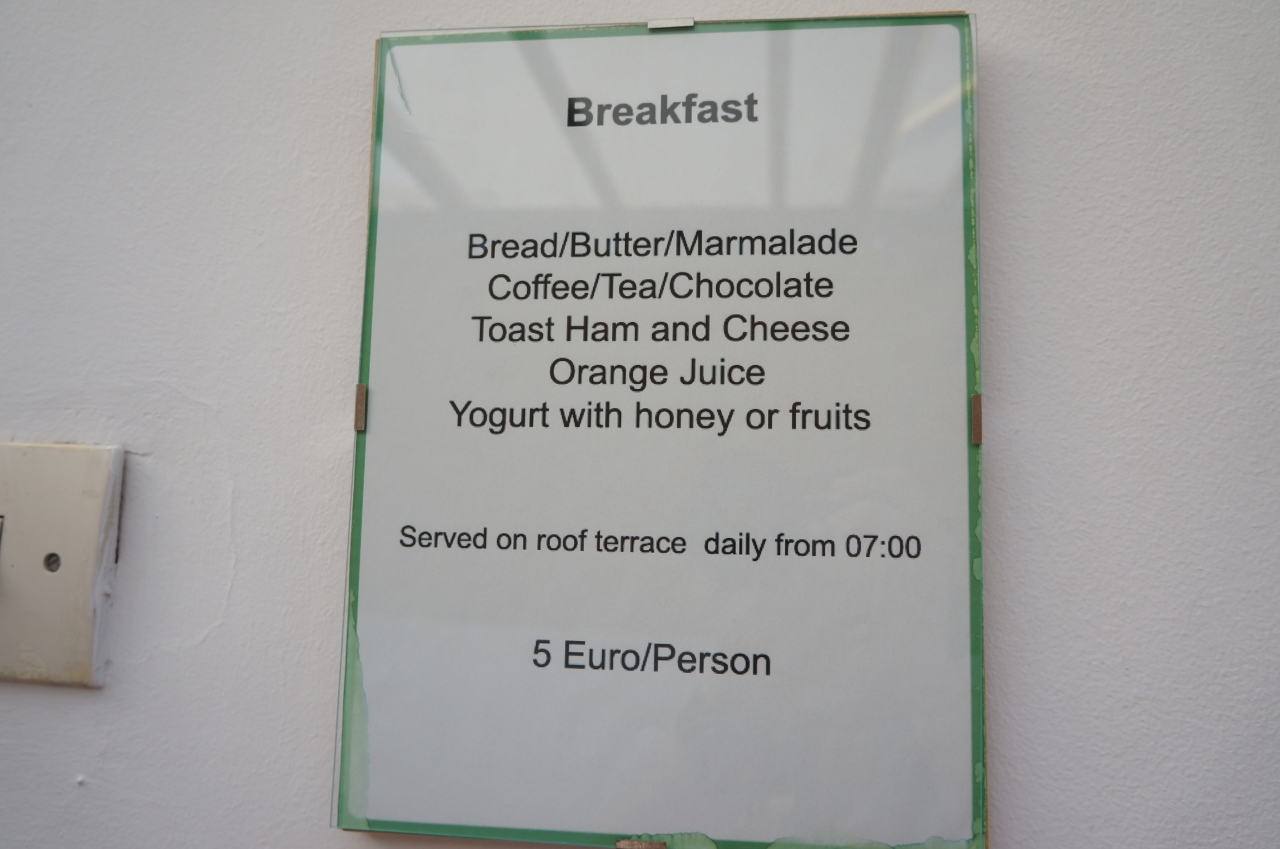 *朝食は別料金で5ユーロ。屋上でいただく。予約不要。直接屋上に行けばOK。コーヒーおかわり可。屋根がないので雨の日はどうなるのかは不明。支払はチェックアウト時に宿泊代と一緒に払うので部屋番号だけ告げる。