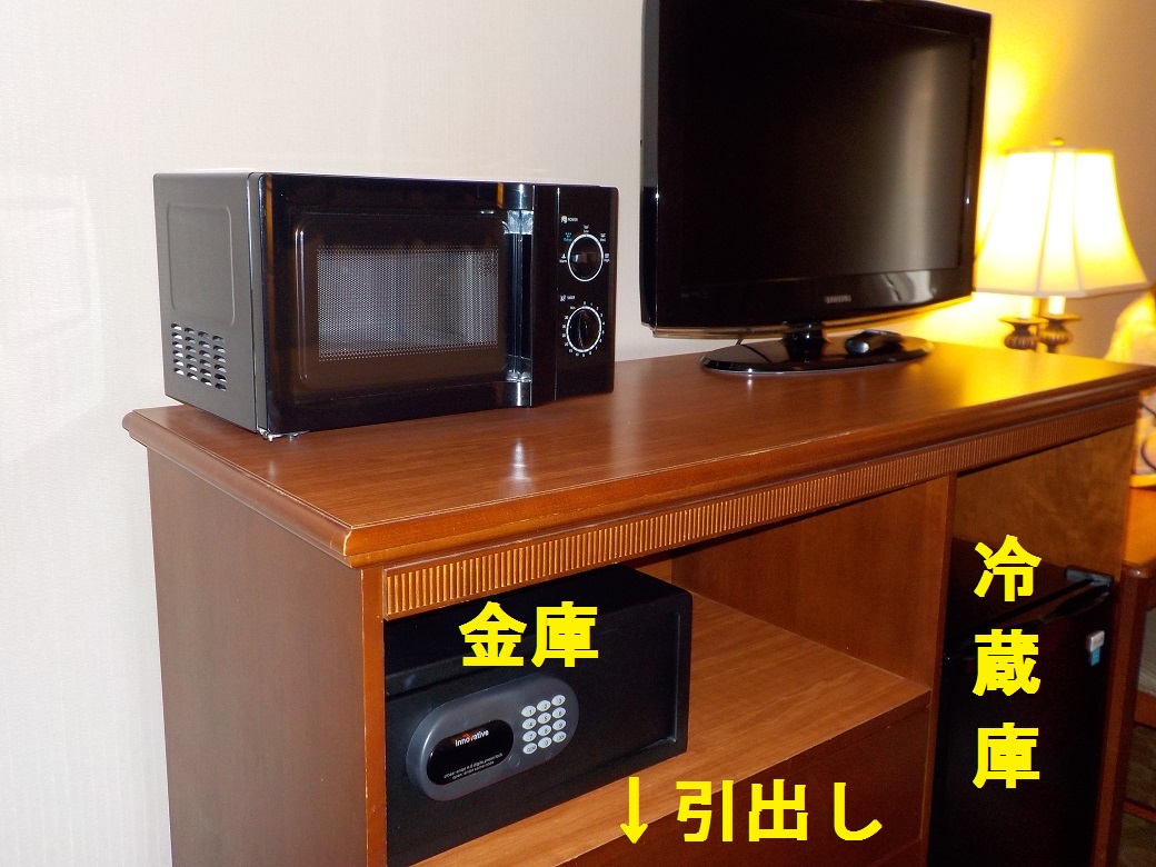 リンス・ボディソープ・ティッシュ・くし・ハブラシ・綿棒・カミソリ・スリッパ・バスローブ・セイフティボックス・湯沸しポット・茶セット・電子レンジはなし。