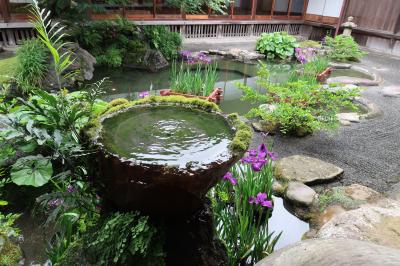 水を一杯にたたえた鉢が涼しげです。花菖蒲の季節だから、しっとりした趣が...