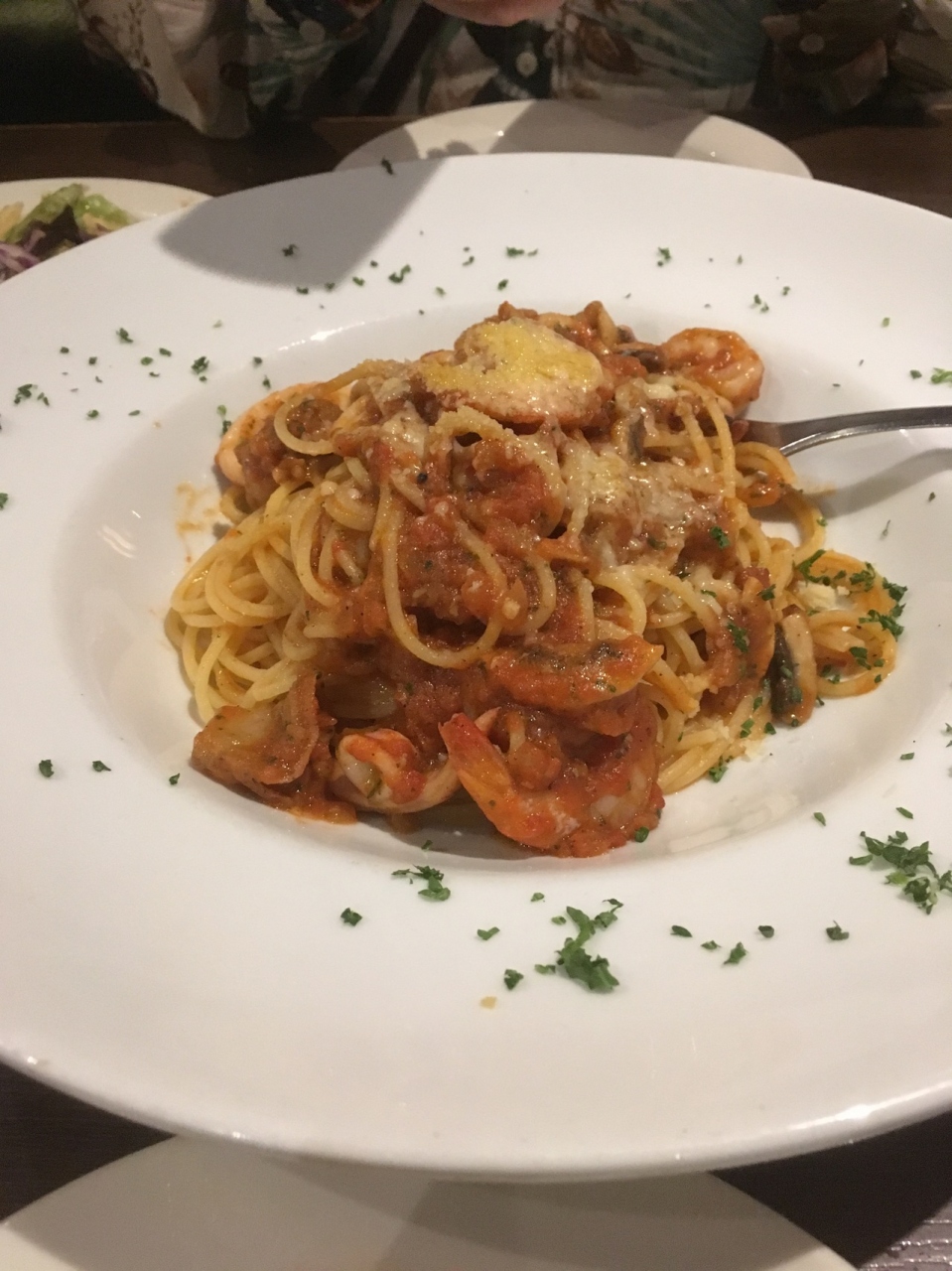サラダのドレッシングが甘めでとても美味しかったです。その他フライドモッツアレラ、シーフードスパゲッティー、ニューヨークチーズケーキで満腹になりました。