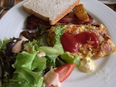 朝食の一枚。バイキング形式。オムレツもオーダーで焼いてくれるし、ジュー...