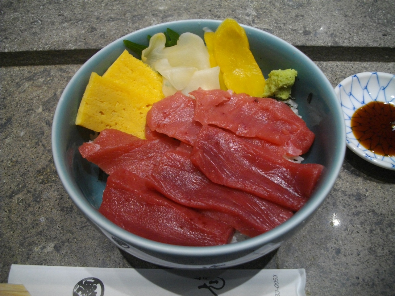 豊洲管理棟3階、水産卸売場棟へ行く途中にあるお寿司屋さん。豊洲の寿司店は、朝でも2千円からという感じだが、たまたま手書きメニューで1千円の鉄火丼があったので、即注文。正直、あまり期待していなかったが、おいしいマグロの切り身がのった丼がきた。また、マグロの身がたくさん入った澄まし汁つき。こじんまりとした店内は清潔で気持ち良い雰囲気。おいしい朝食を食べることができた。