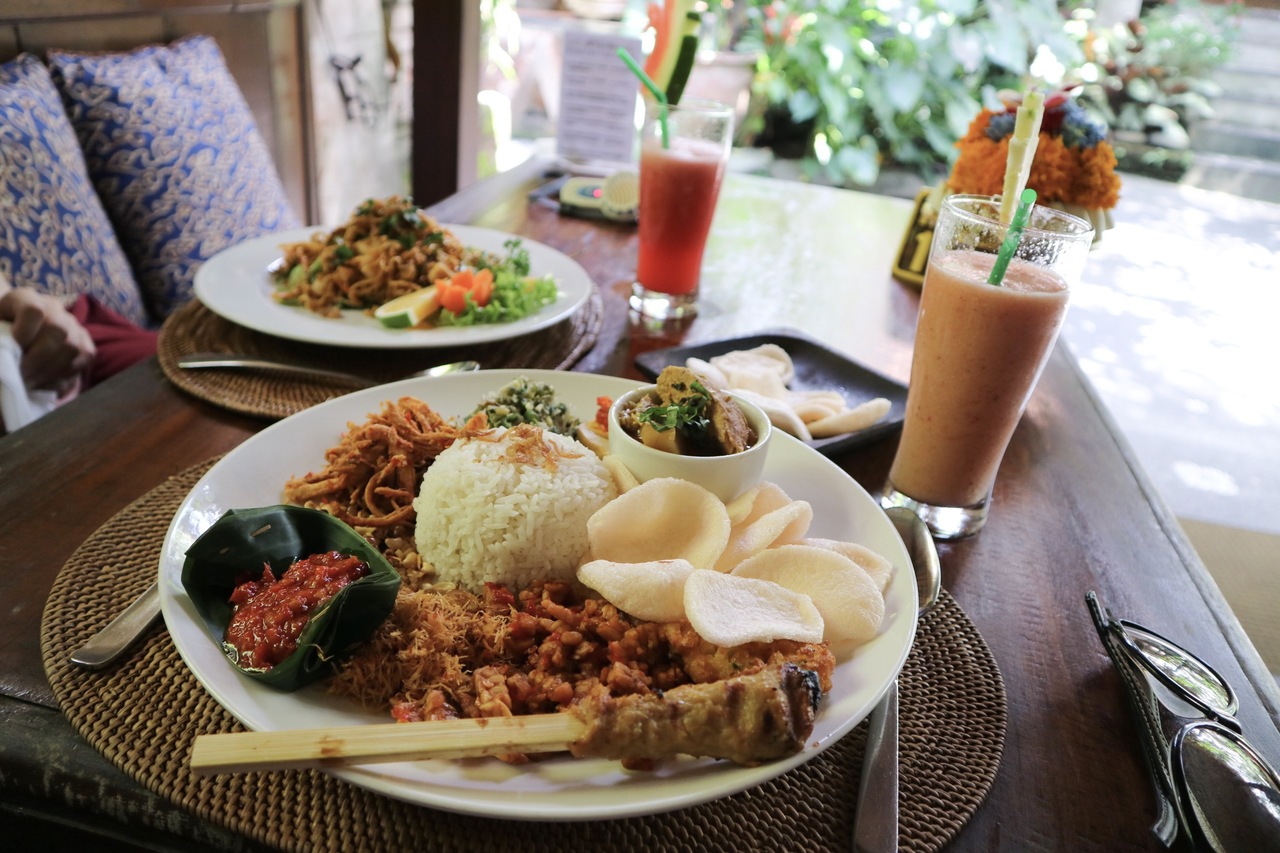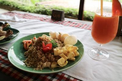 混雑していますが、並ばずに入れるレベルです。棚田を見ながら日本人向けの美味しいナシゴレンをいただきました。フレッシュフルーツジュースも美味しいです。