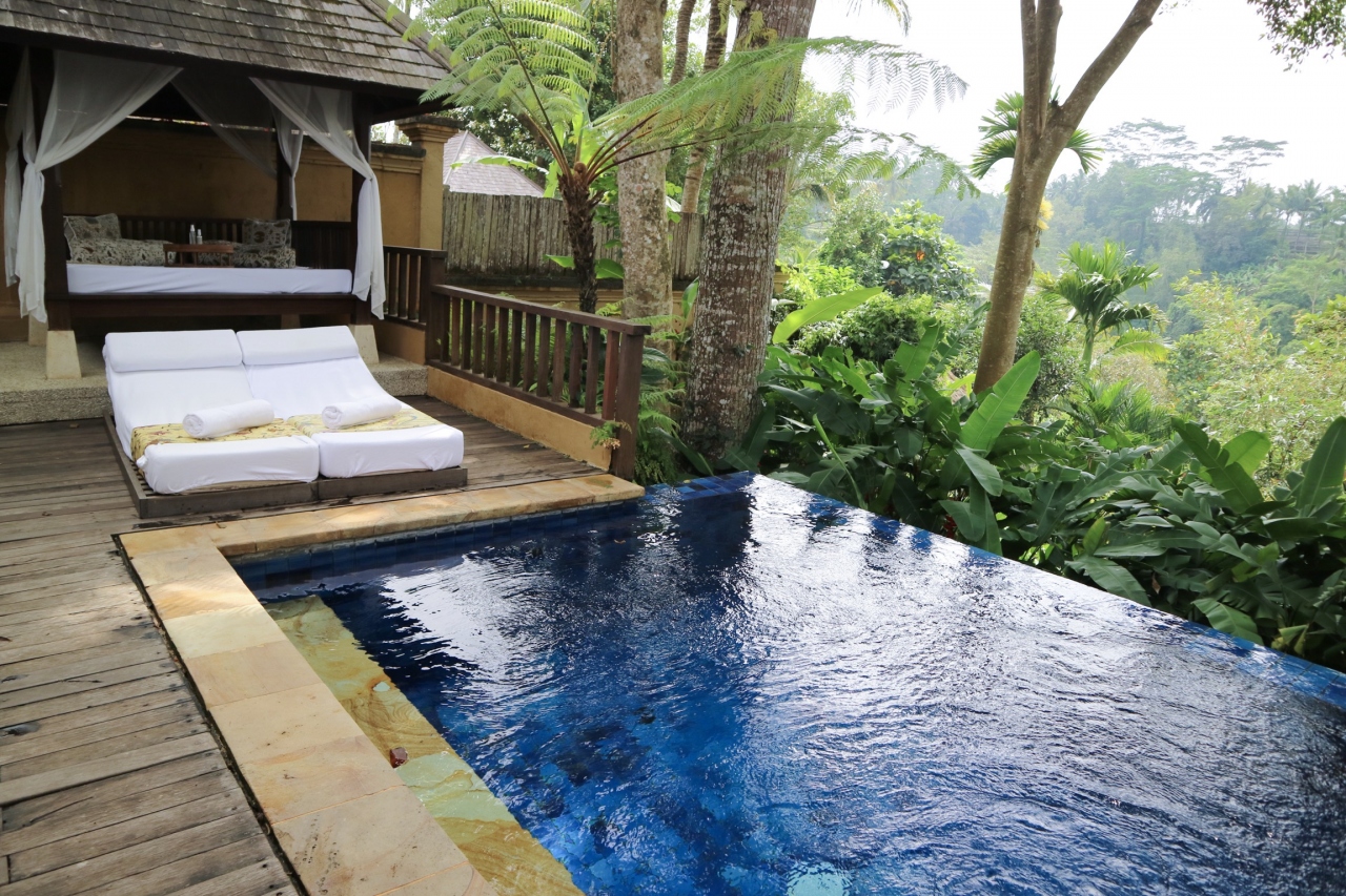 ウブドの中心部から車で15分ほどのタンガユダ村にあるリゾートホテルです。すべてがヴィラタイプのお部屋で、私たちはプールヴィラを予約しました。プライバシーが完全に保たれていて、静かで落ち着いたホテルです。メインプールが素敵です。