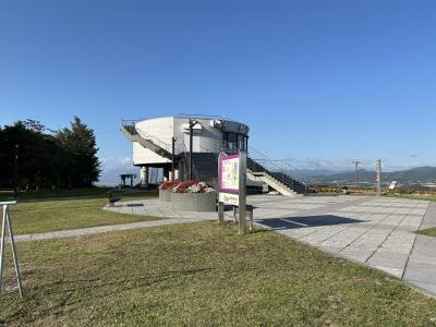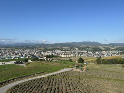 日の出公園キャンプ場の丘を登っていくと展望台があり、朝早かったために展望台はまだ開いてませんでしたが、屋上に登ってみると上富良野町の街並みがミニチュアのように見え十勝岳連峰の山なみがきれいに見えました。ラベンダーは8月下旬までだったようで咲いていませんでした。白いアーチ状のモニュメント「愛の鐘」があり人気のフォトスポットになっているようです。