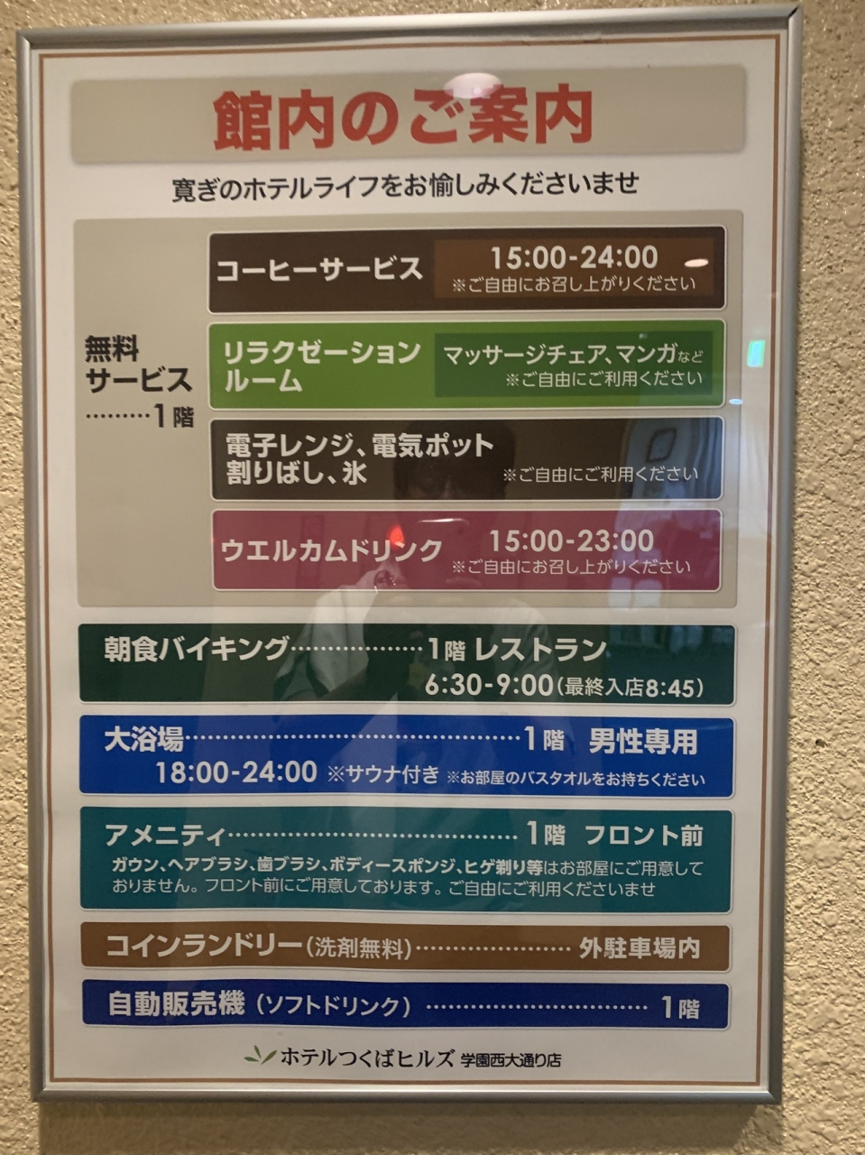 つくば駅からは徒歩15分くらいかかります。サービスがとても充実していてウェルカムドリンクでアルコールやソフトドリンク、コーヒーがチェックインした日は23時まで飲み放題です。朝食も無料でついていました。アメニティも充実していてシャンプー、リンスも数種類用意してあります。リラクゼーションルームもあり漫画やマッサージ機が置いてありました。男性専用の大浴場もあります。部屋も適度な広さがあります。泊まってとても満足でした。
