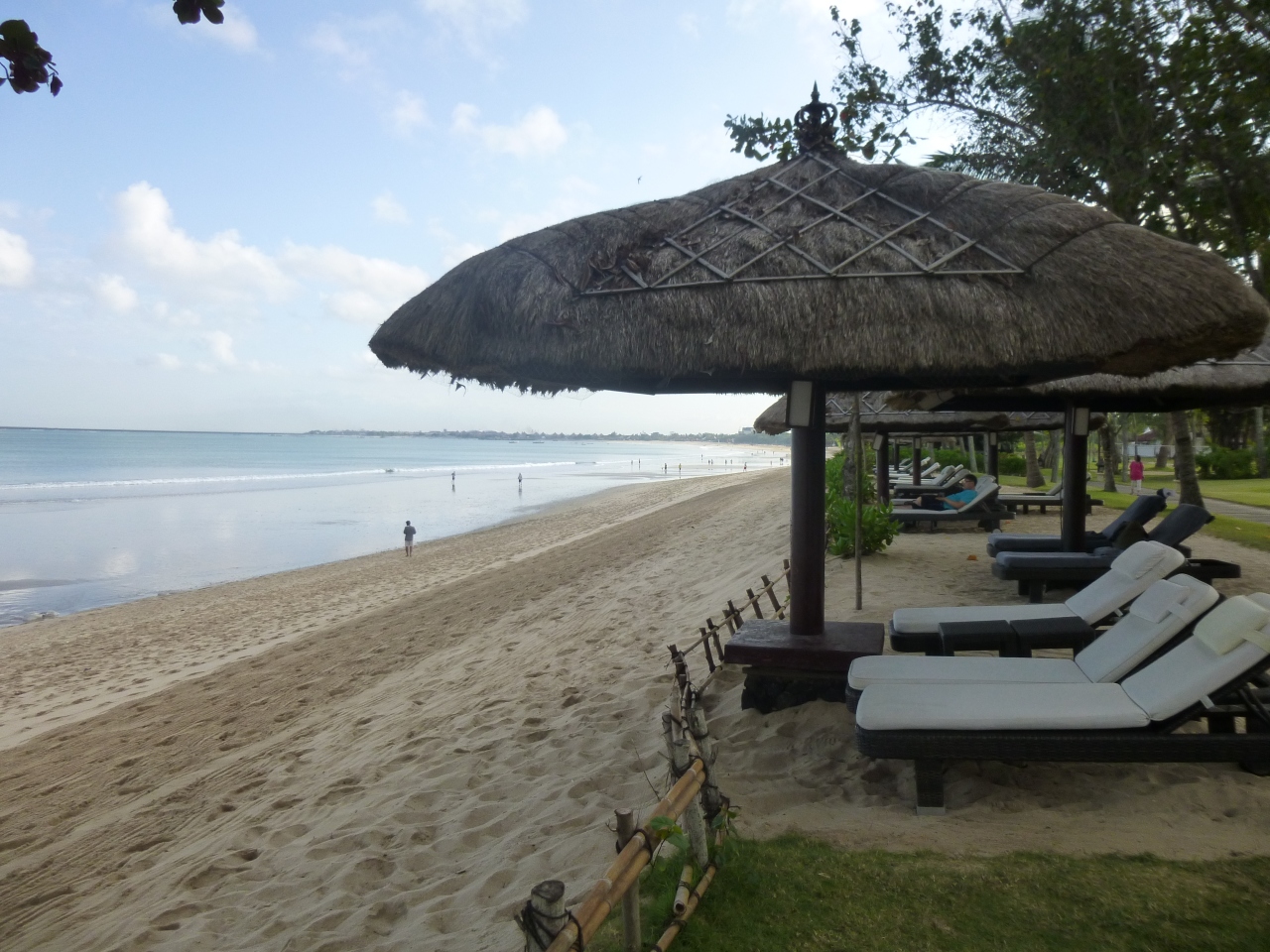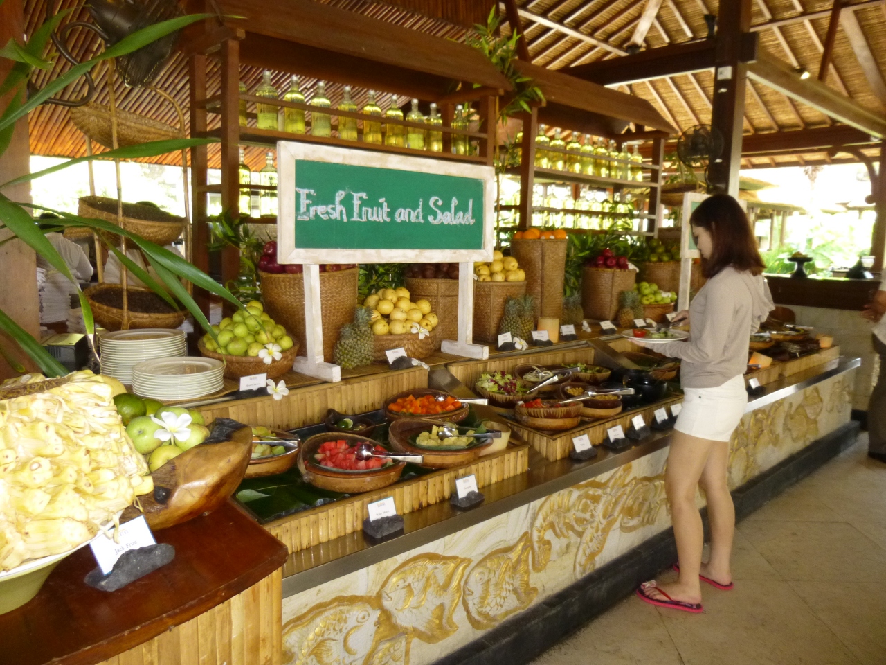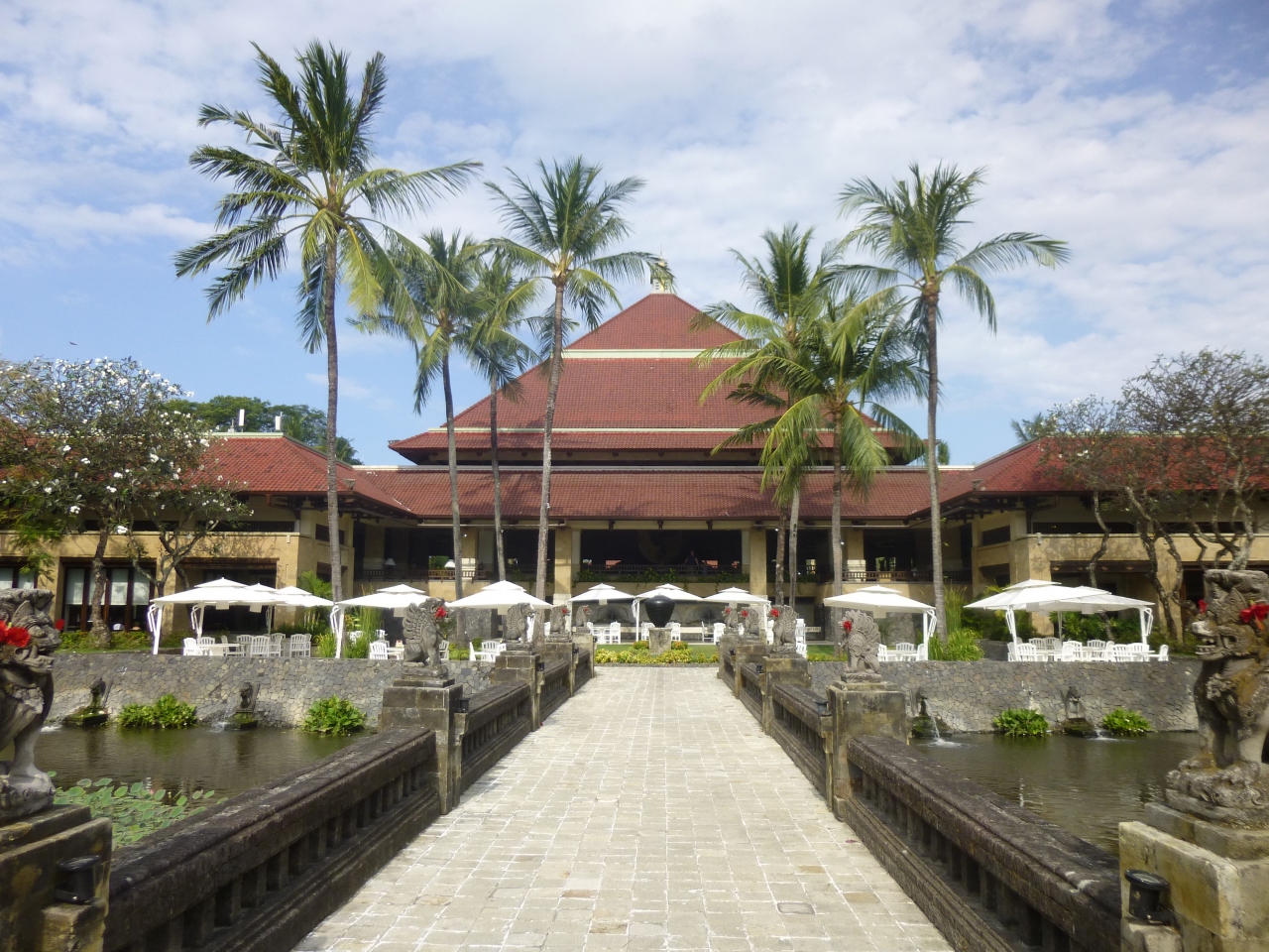 とても敷地が大きく、ジンバランビーチがすぐ前にあり、プールと海もすぐそばで交互に遊ぶことができました。ホテルも広いため自分の泊まった部屋はロビーから遠いところにありロビーへの行き来が大変でした。朝食のレストランは3か所あり3日間の宿泊でそれぞれ利用しましたが、バイキングでした。初日に行ったロビーそばのタマンギランテラスレストランが一番大きくメインのレストランで、洋食から梅干しまであってメニューも豊富でした。2日目はベラチェチーナというイタリアンレストランに行きましたが、こじんまりとして混雑もなくビーチそばにあり静かな気分で良かったです。3日目のジンバランガーデンプールサイドレストランは名前の通りプールサイドにありインドネシア料理のコーナーがありました。